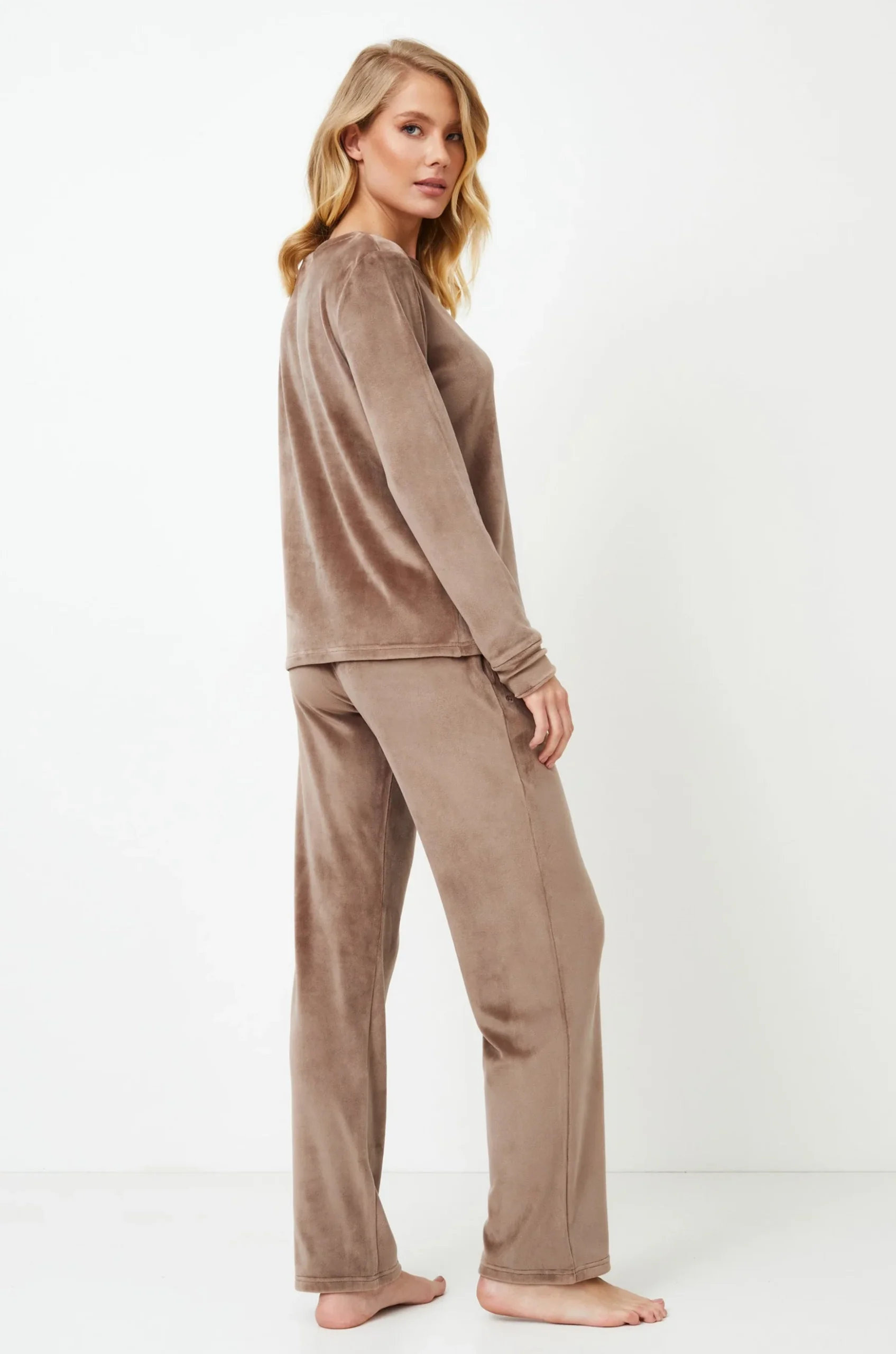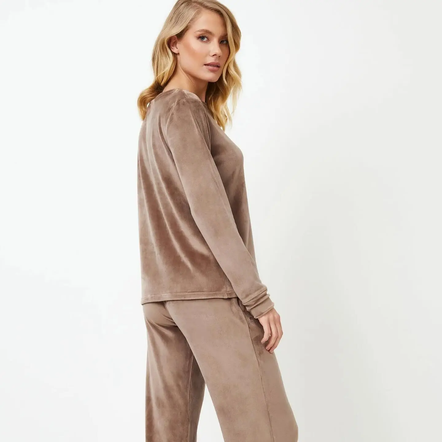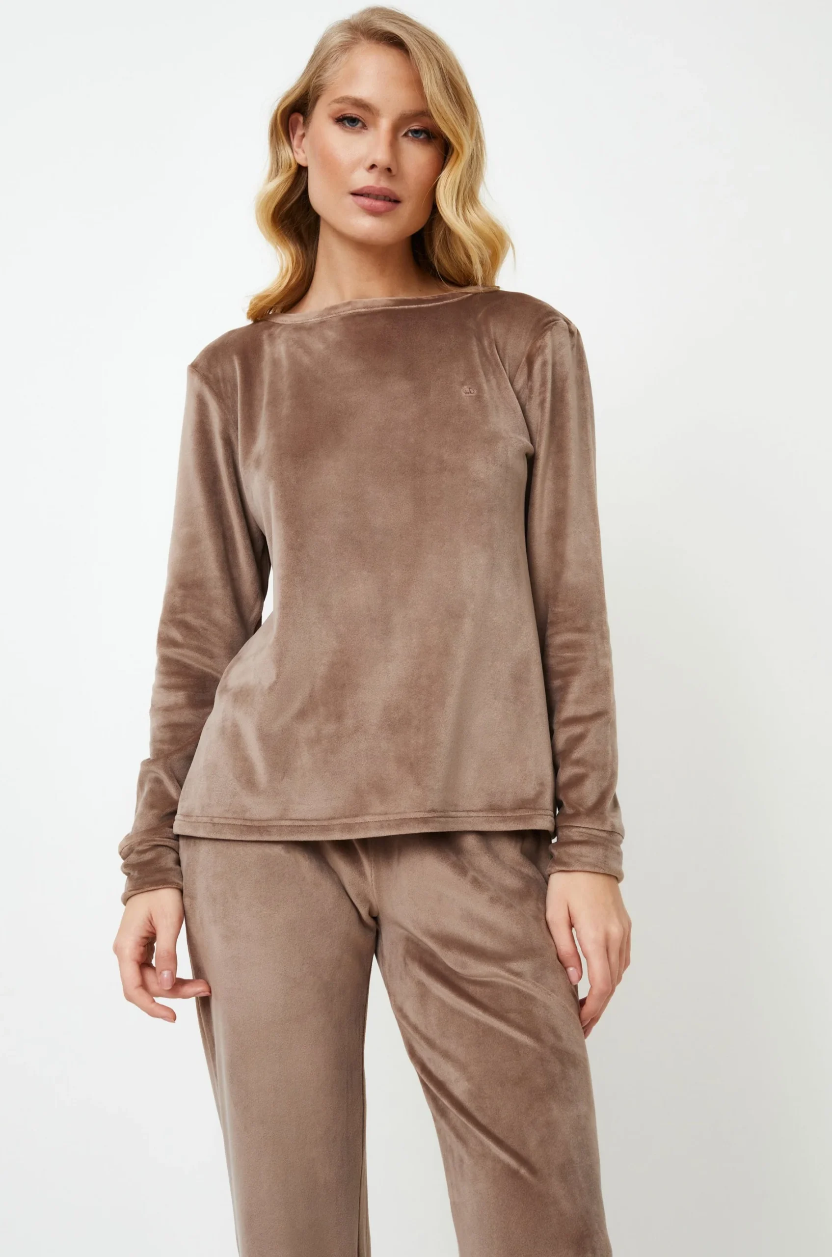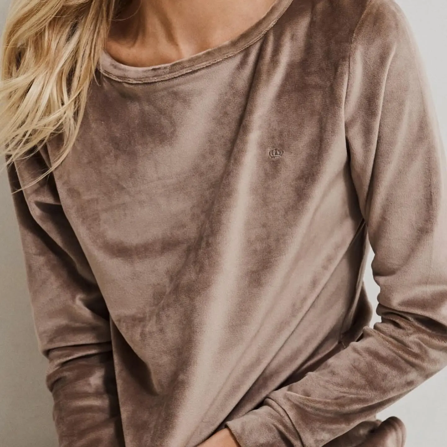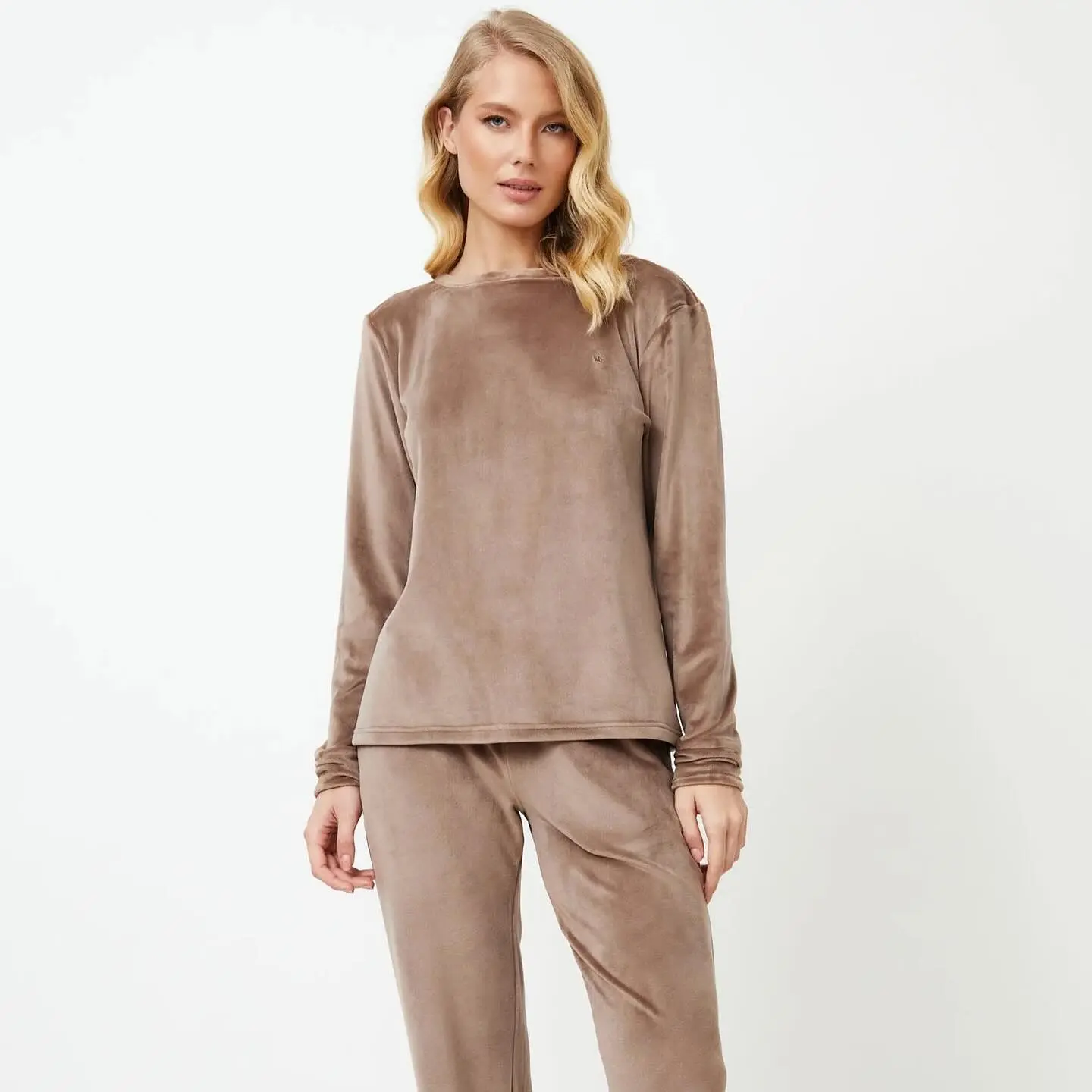 De Chiarra set, waar comfort elegantie ontmoet. Het bovenstuk met lange mouwen en een delicate kroonstiksel op de rug straalt luxe uit. De klassieke broek met zakken combineert functionaliteit met stijl. In een weelderige bruine tint is deze set de perfecte keuze voor gezellige avonden en stijlvolle ochtenden.