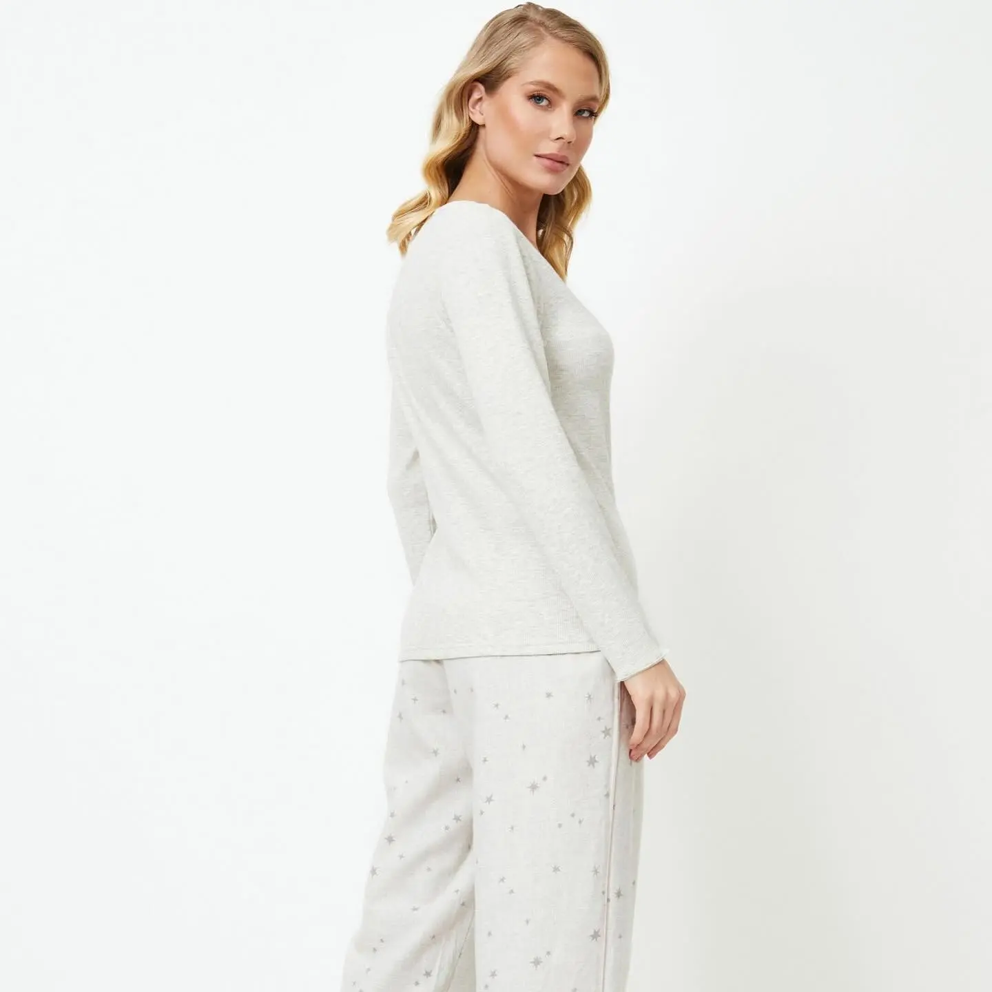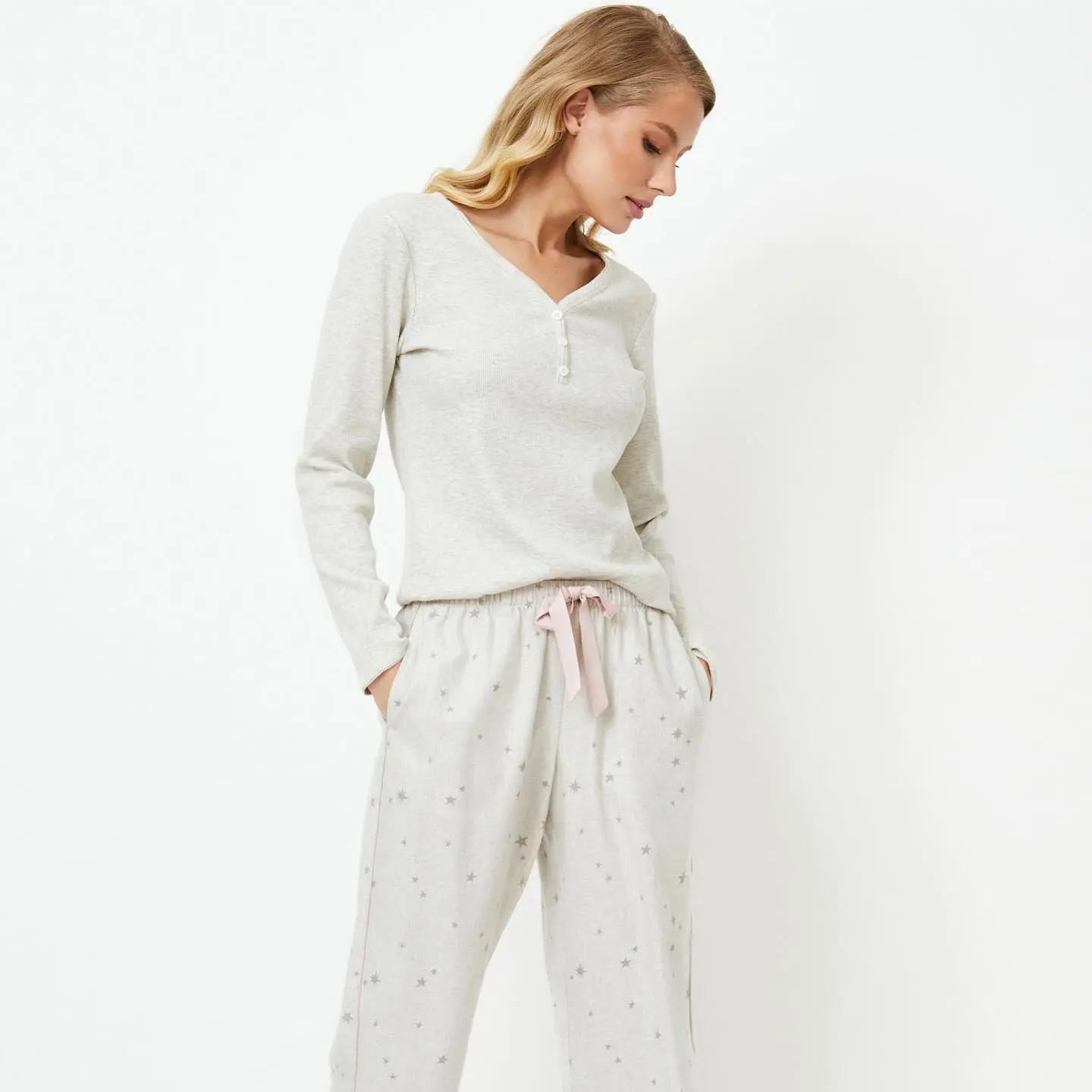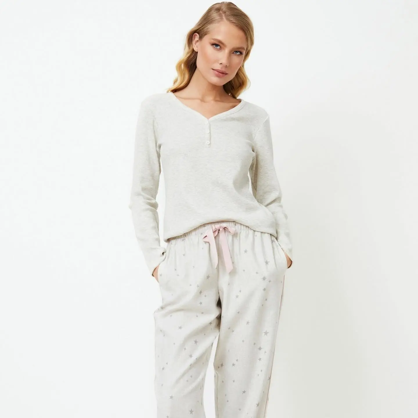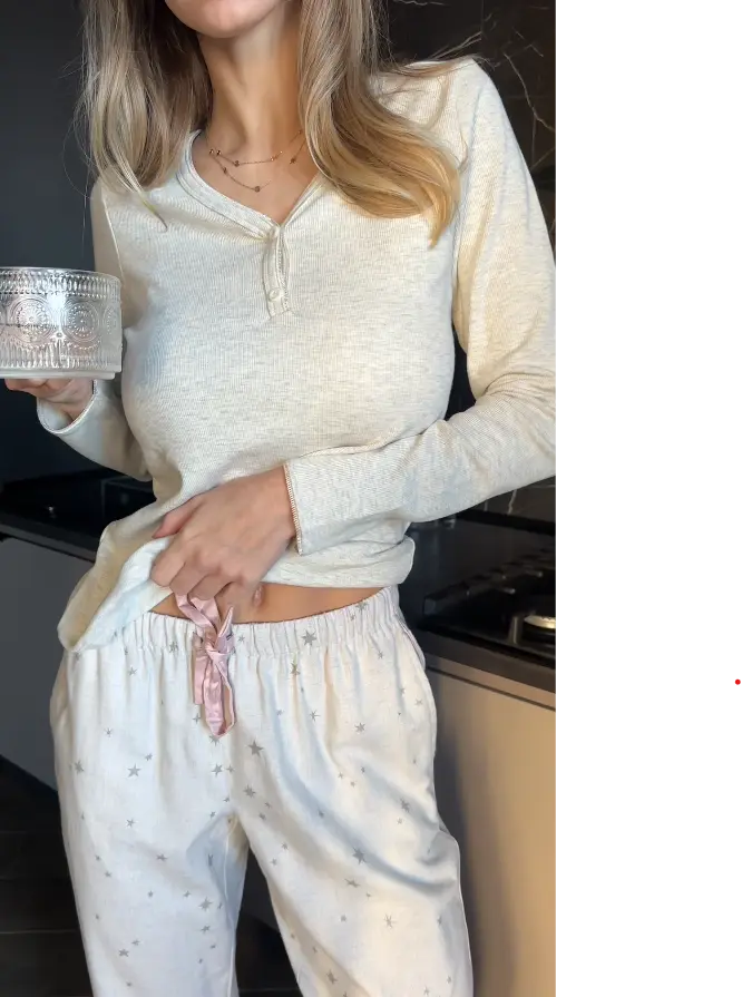 De Doreen Long pyjama – uw keuze voor stijlvolle, comfortabele nachten. Het bovenstuk is gemaakt van een elastische, geribbelde viscosemix in een gemêleerd grijze tint. Het heeft lange mouwen en een stijlvolle V-hals, verfraaid met knoopjes. De set wordt gecompleteerd door een broek van zacht, stevig katoen in een rustgevend grijs patroon bezaaid met sterren. De broek heeft zakken, een tailleband met roze strik en bijpassende roze biesjes aan de zijkanten. Ervaar comfort en elegantie met de Doreen Long pyjama, perfect voor ontspanning. En het leuke is: met deze pyjama bent u gegarandeerd de ster van uw eigen show voor het slapengaan!