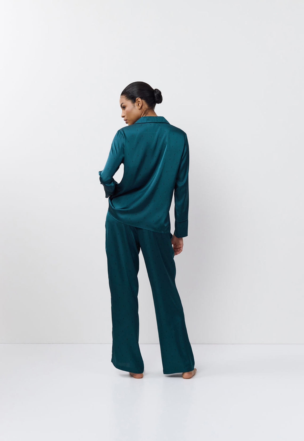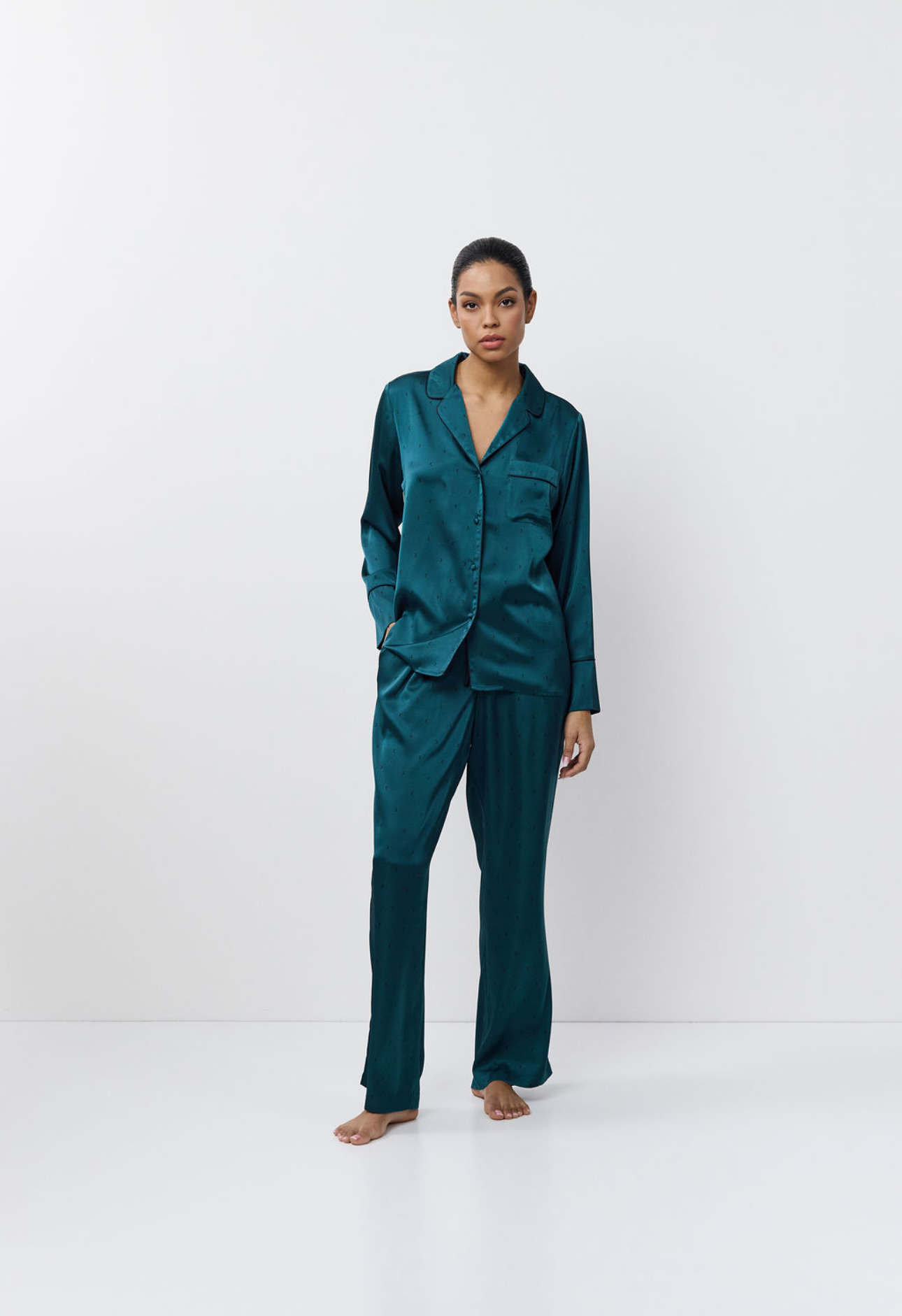 Luxueuze satijnen pyjamaset met broek in een rijke smaragdgroene kleur. Naadloos maanpatroon. Klassieke shirt-stijl top met biesafwerking rond kraag, zakken en manchetten. Hoge manchetten. U-vormige borstzak. Stoffen knopen. Minimalistische verstelbare tailleband. Broek met zijzakken. Model is 175 cm lang en draagt maat S.