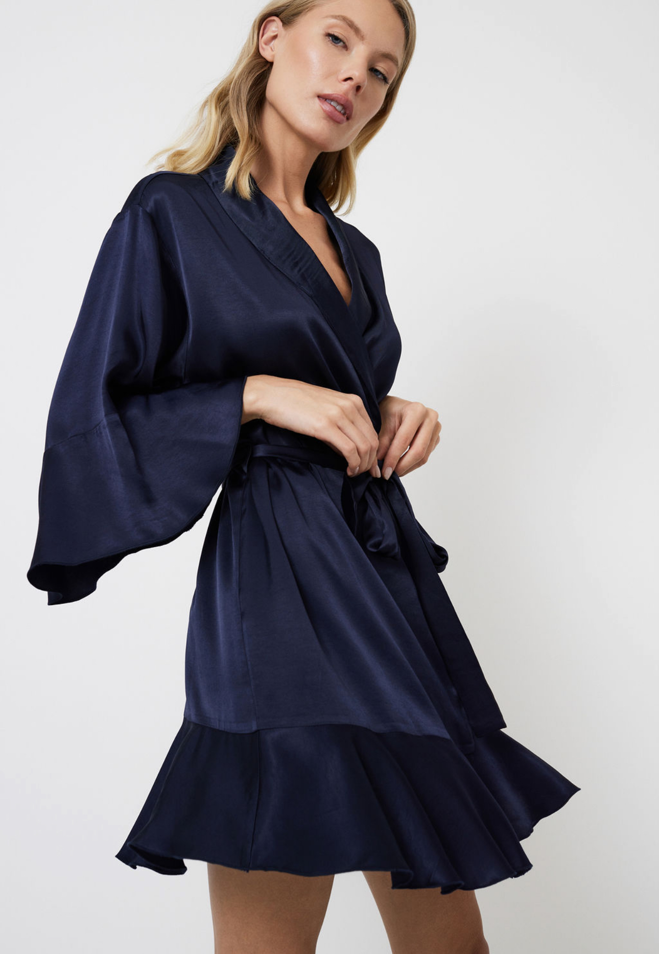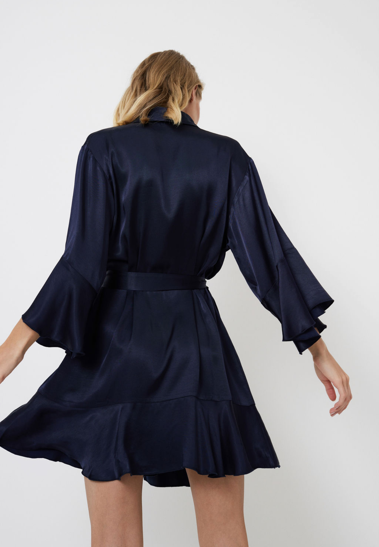 Heeft licht vallende schouders en wijde mouwen.