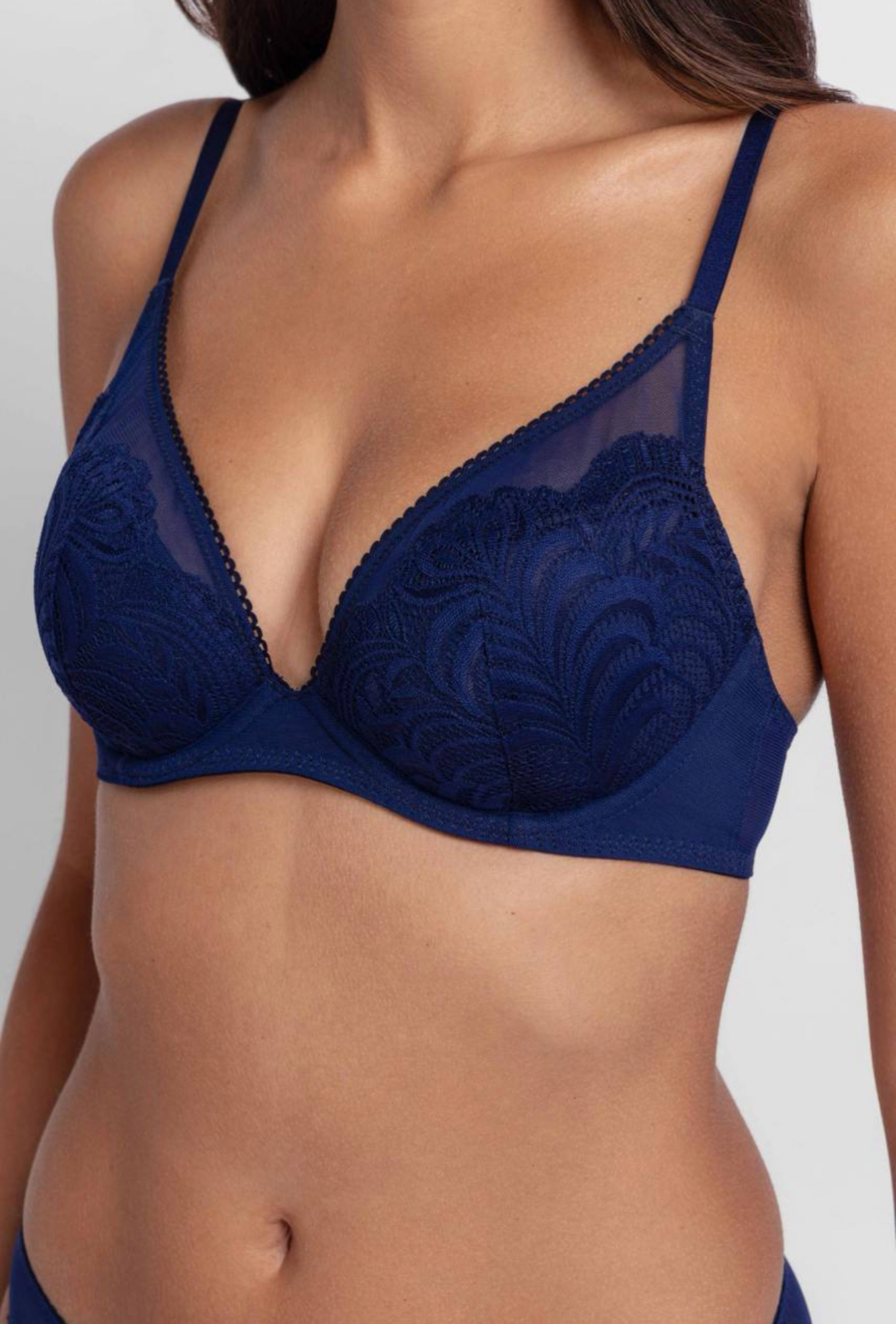 Deze verfijnde kanten beha in diep donkerblauwe tint oogt ingetogen, elegant en zeer luxueus. De rijke kleur accentueert prachtig de huidskleur en voegt vertrouwen en vrouwelijkheid toe aan uw uitstraling.