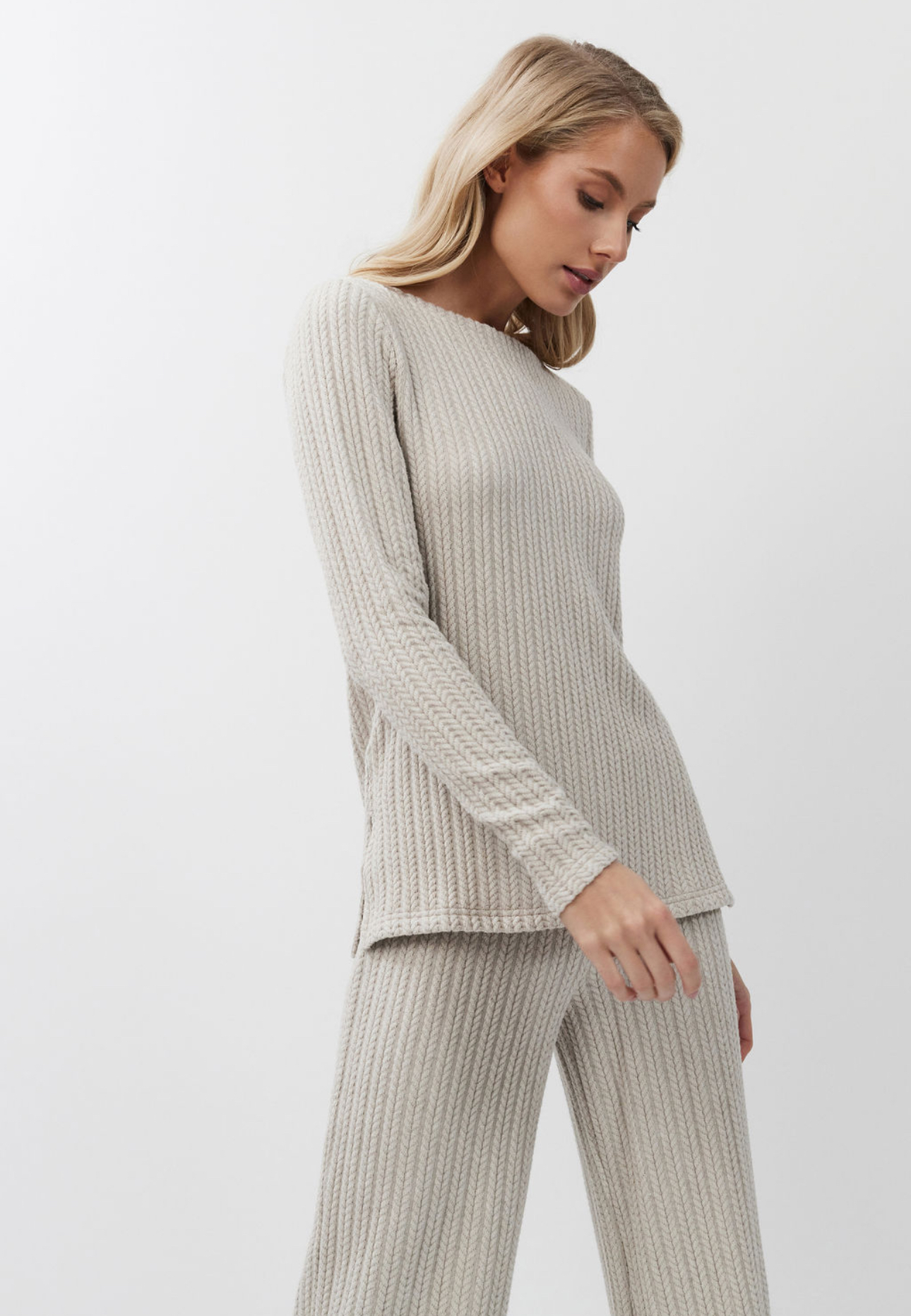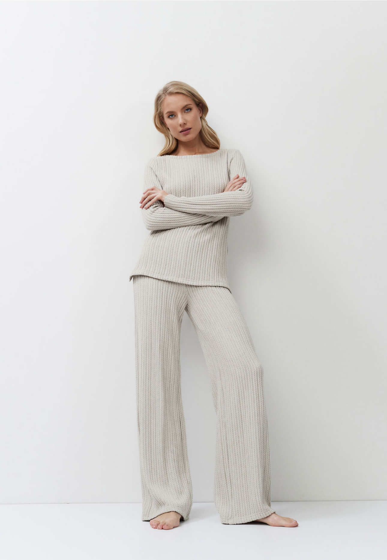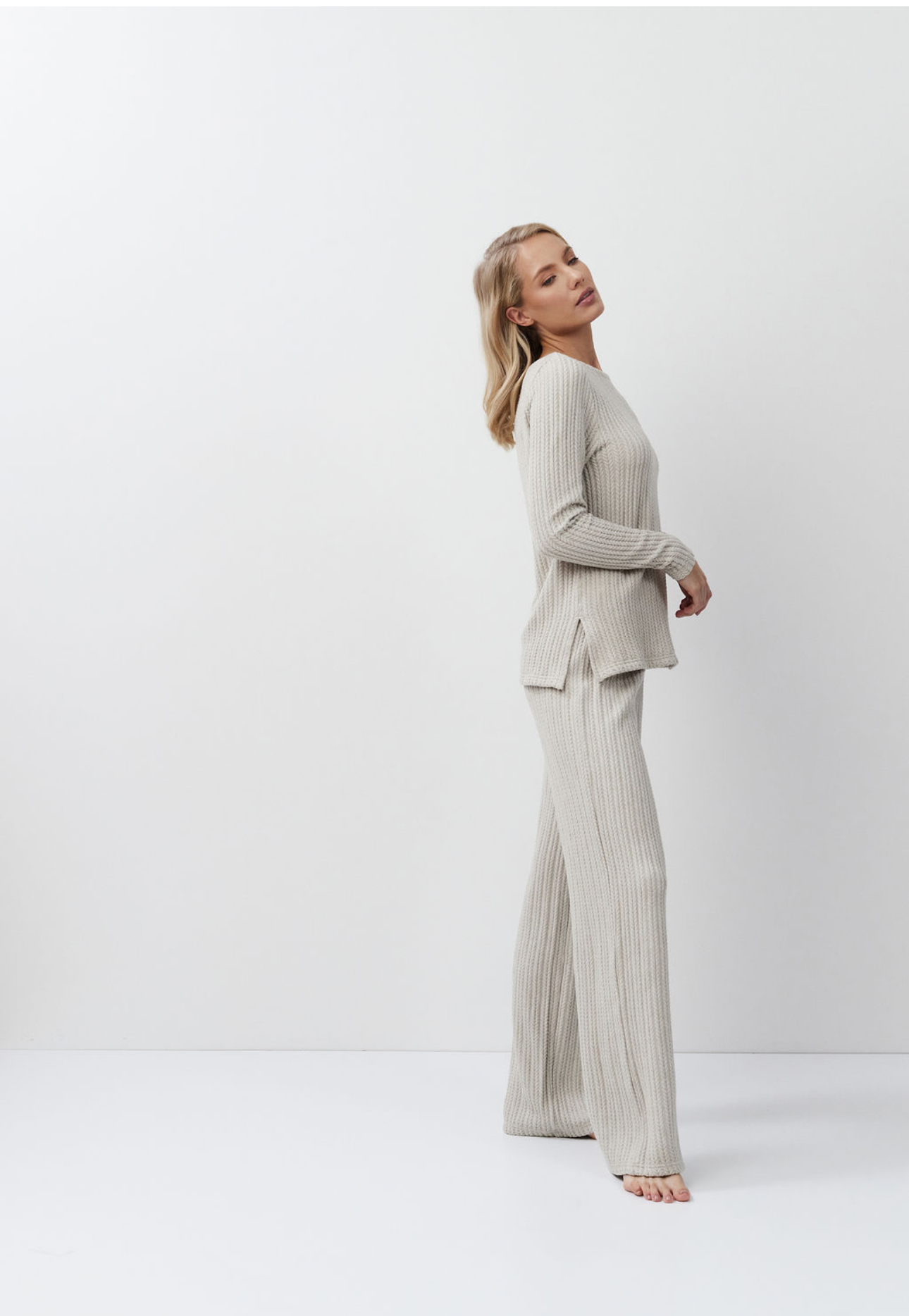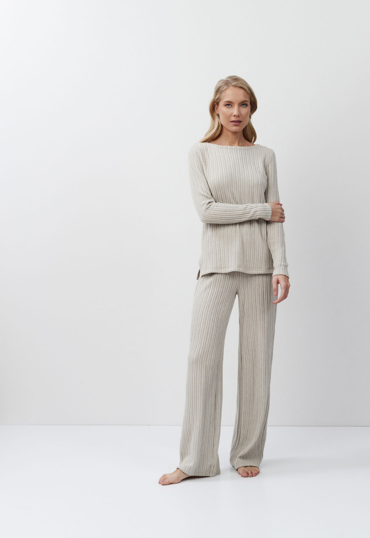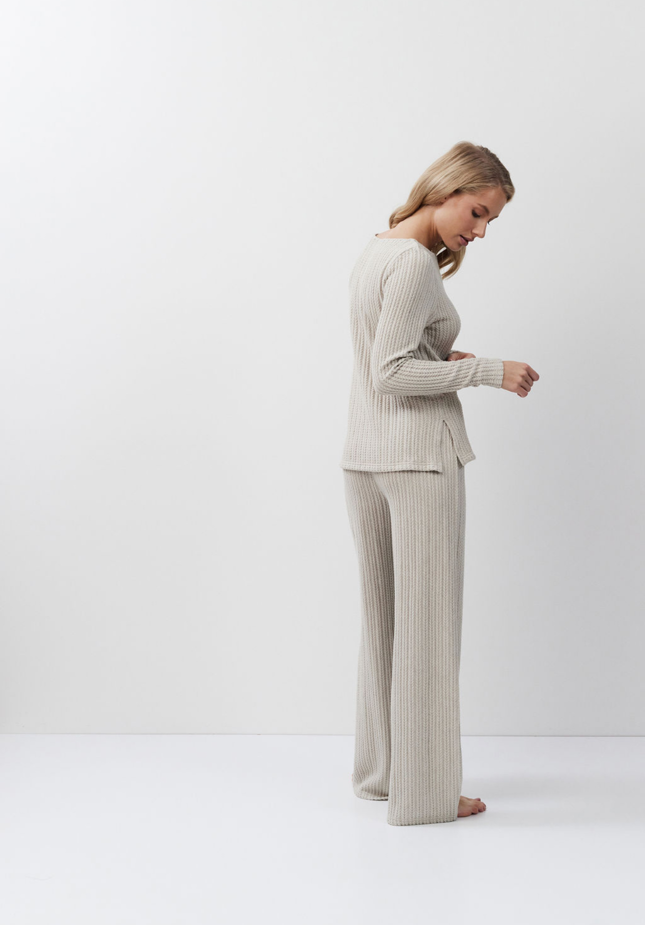 Een onberispelijk chique loungewear set met een geribde breistructuur.