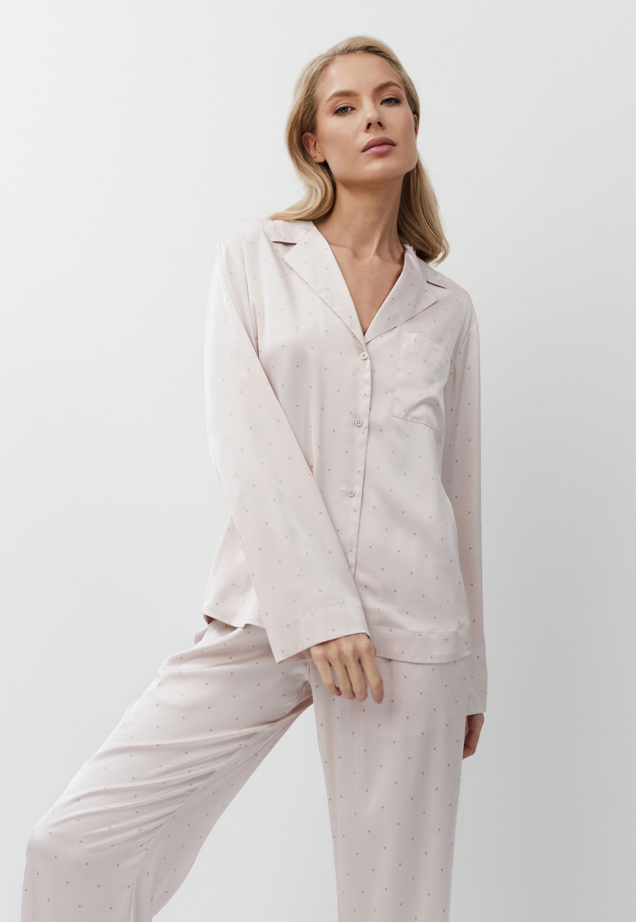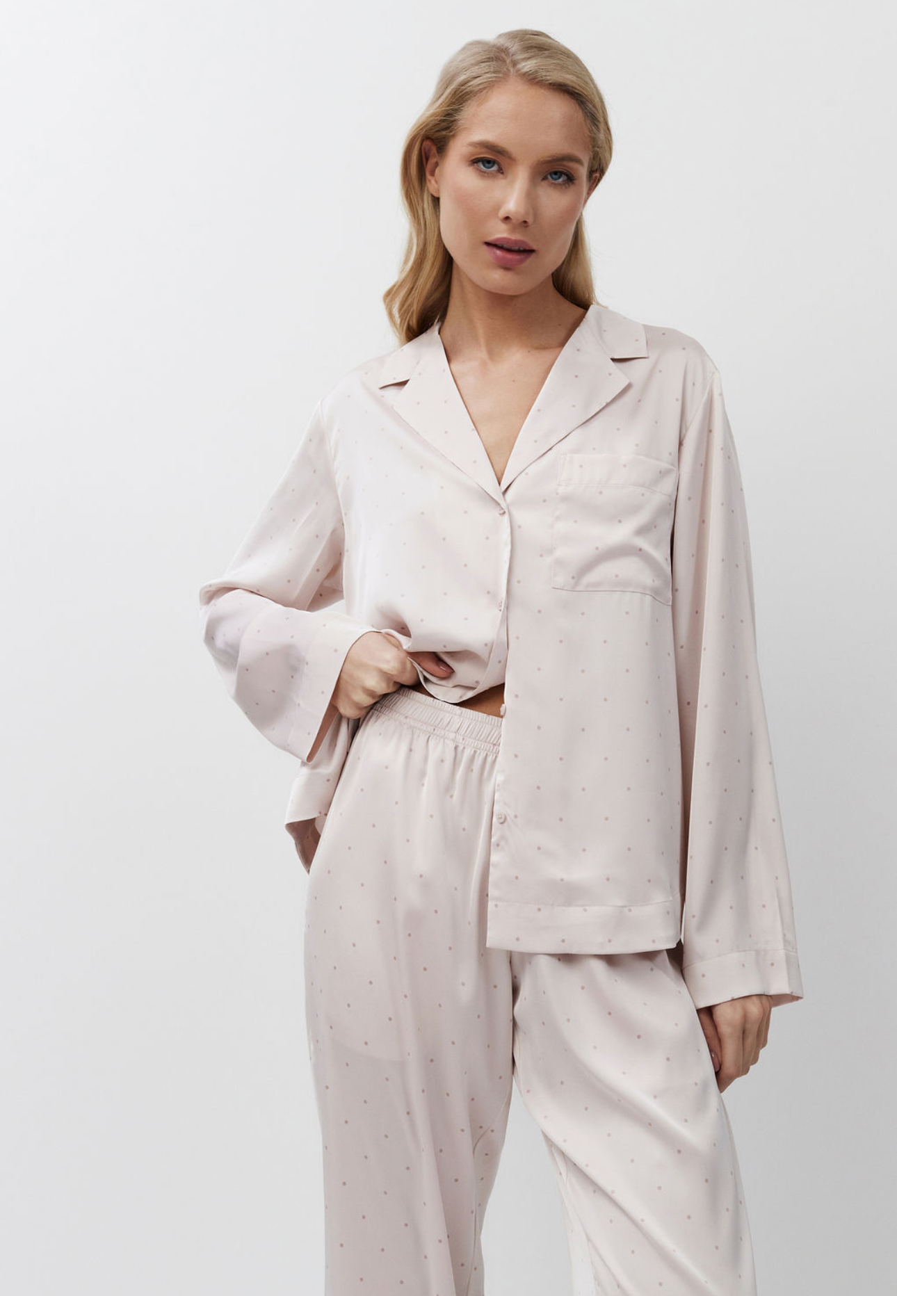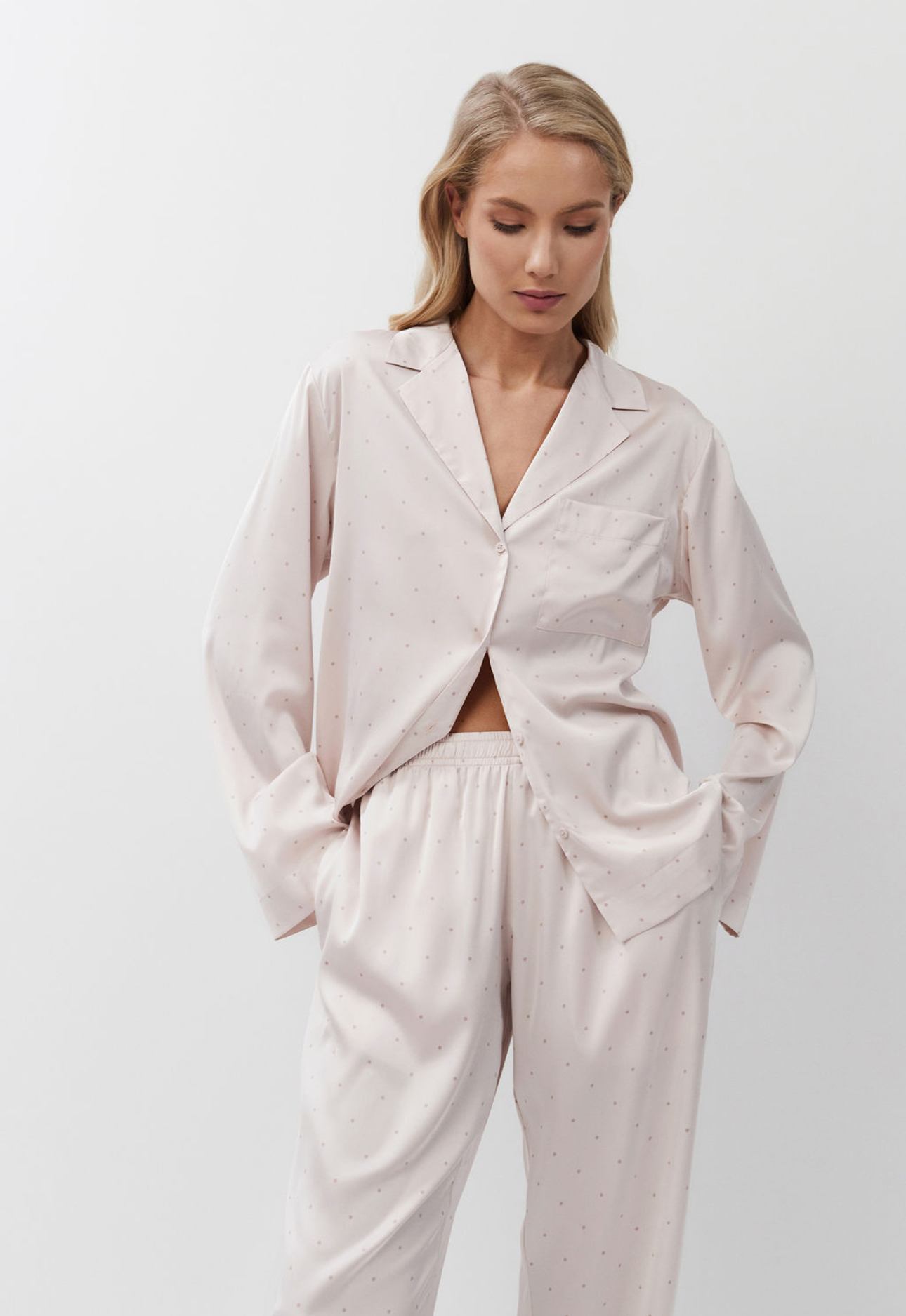 Luxueuze zachtroze satijnen pyjamaset met broek van Aruelle!
