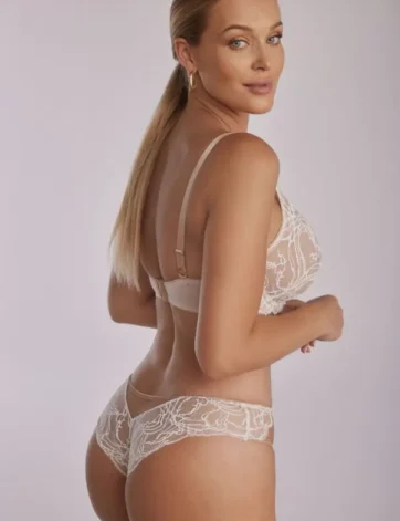 De achterkant van de Brazilian slip is gemaakt van zachte dubbele tule, die zorgt voor een glad silhouet en volledige onzichtbaarheid onder kleding, perfect aansluitend op het figuur. Het materiaal is zacht en aangenaam om te dragen, wat comfort gedurende de hele dag garandeert. Een decoratieve gouden ring maakt de look af, met een sensueel accent.