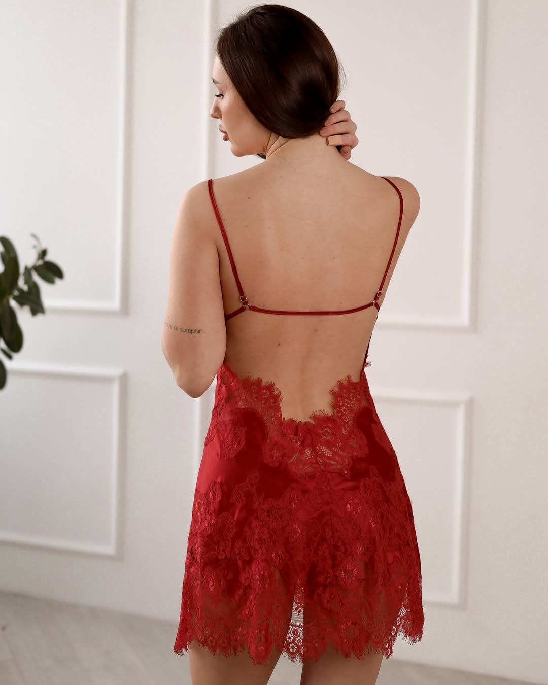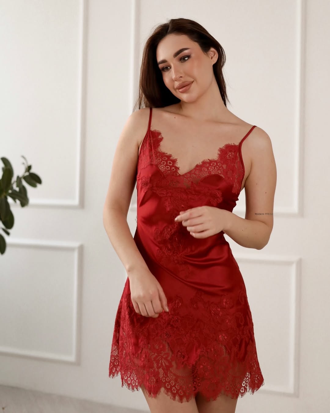 Nachthemd uit de Ruby collectie van het Oekraïense merk. Gemaakt van zachte en hoogwaardige zijde-satijn in bordeauxrode kleur, met semi-aansluitende pasvorm en effectvolle open rug. Model met dunne verstelbare bandjes, V-hals en mini-lengte, versierd met brede inzetstukken van kant en kanten applicaties, rug afgewerkt met dwarsbandje. Zeer mooi en comfortabel, benadrukt de sensualiteit van de vrouwelijke uitstraling