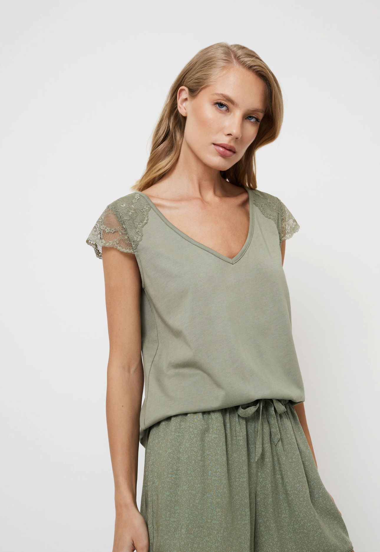 Een ingetogen groen abstract patroon harmonieert met de kanten details.