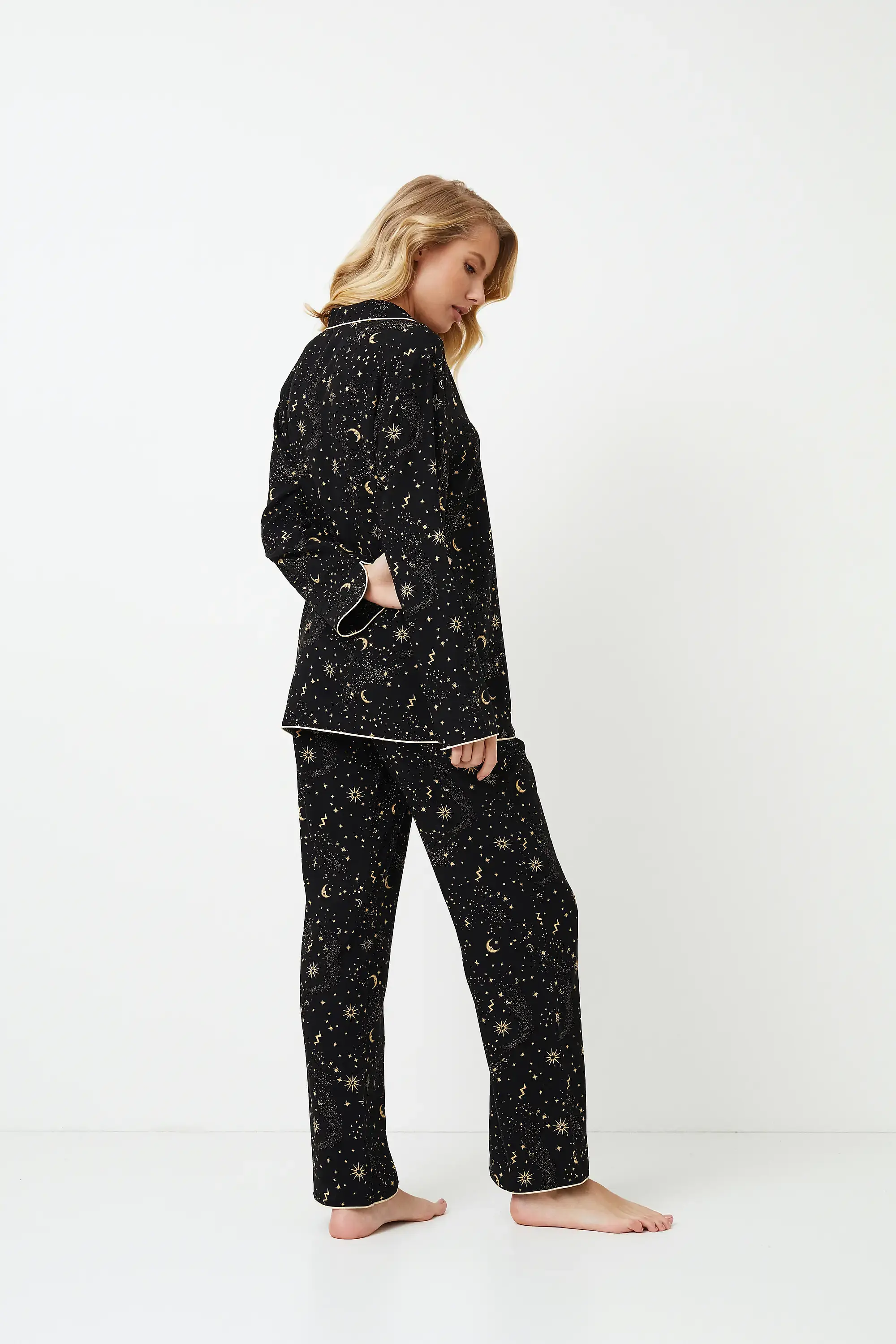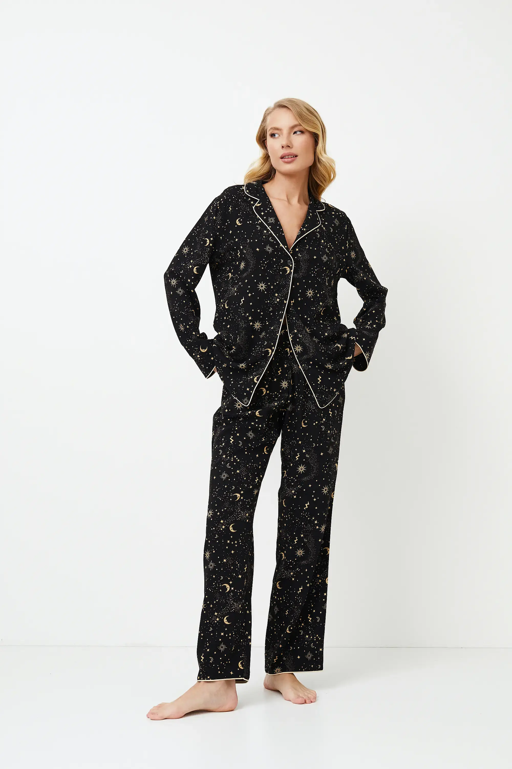 Wij presenteren de Alexandra Long pyjama, waar comfort en elegantie samenkomen voor uw nachtelijke gelukzaligheid. Het shirt met lange mouwen en knoopsluiting heeft een stijlvolle V-hals met contrasterende bies langs de randen van de kraag, voorkant, onderkant en manchetten. De broek heeft een klassieke snit met handige zakken en bijpassende bies langs de onderrand. De pyjama is uitgevoerd in een indrukwekkende zwarte kleur, versierd met gouden ornamenten van de nachtelijke hemel, wat haar bijzondere charme geeft. Dompel uzelf onder in nachtelijke luxe met de Alexandra Long pyjama, waar elk detail schittert met kosmische betovering.