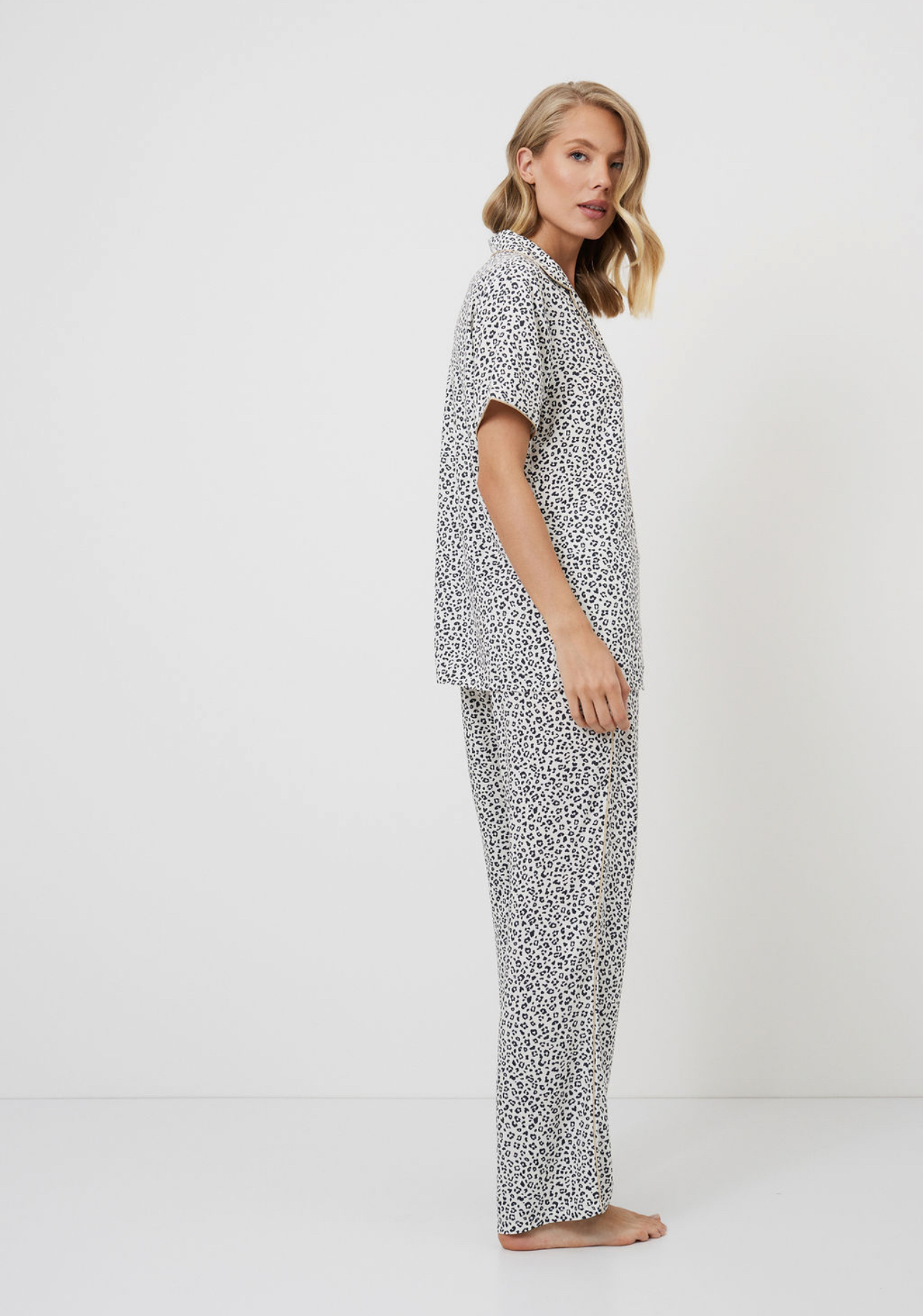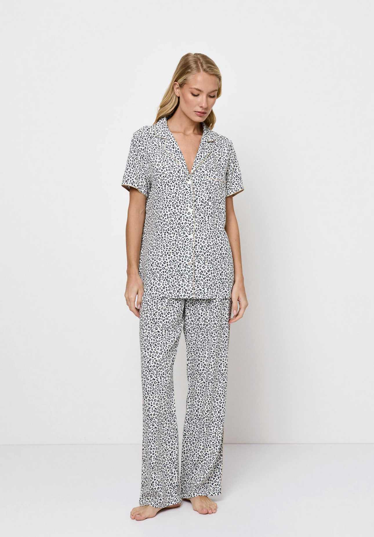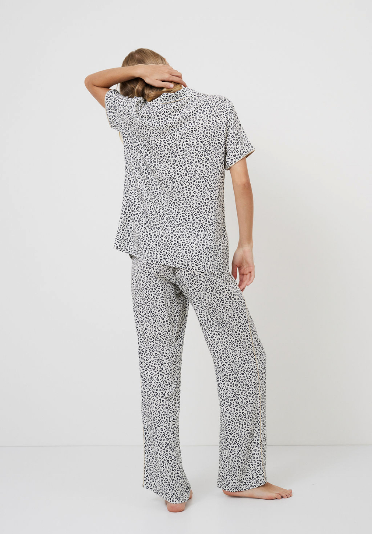 De pyjama is gemaakt van lichte viscose in een luxueuze luipaardprint.