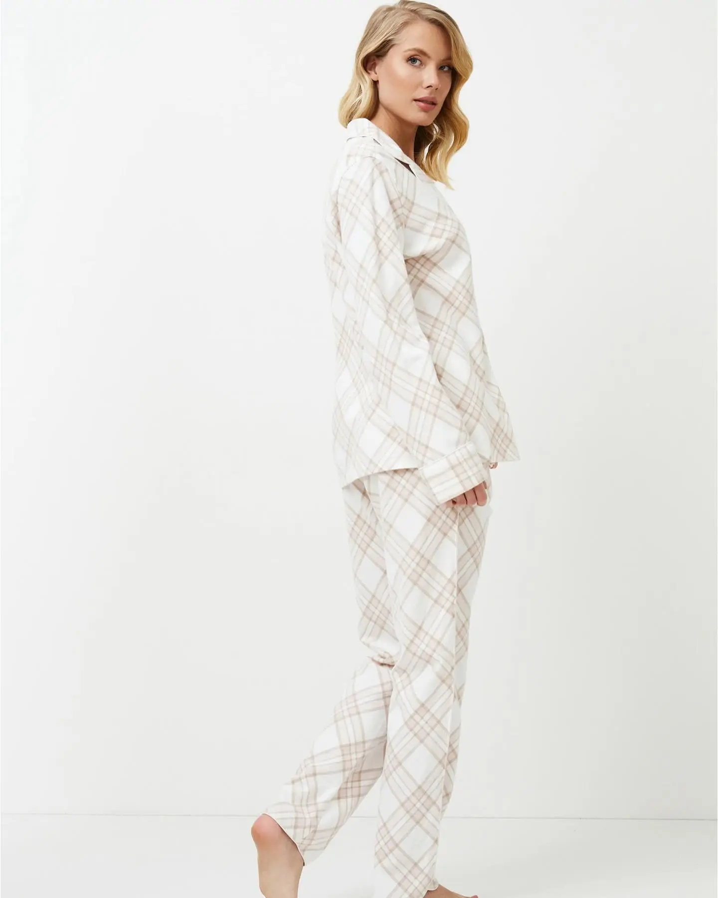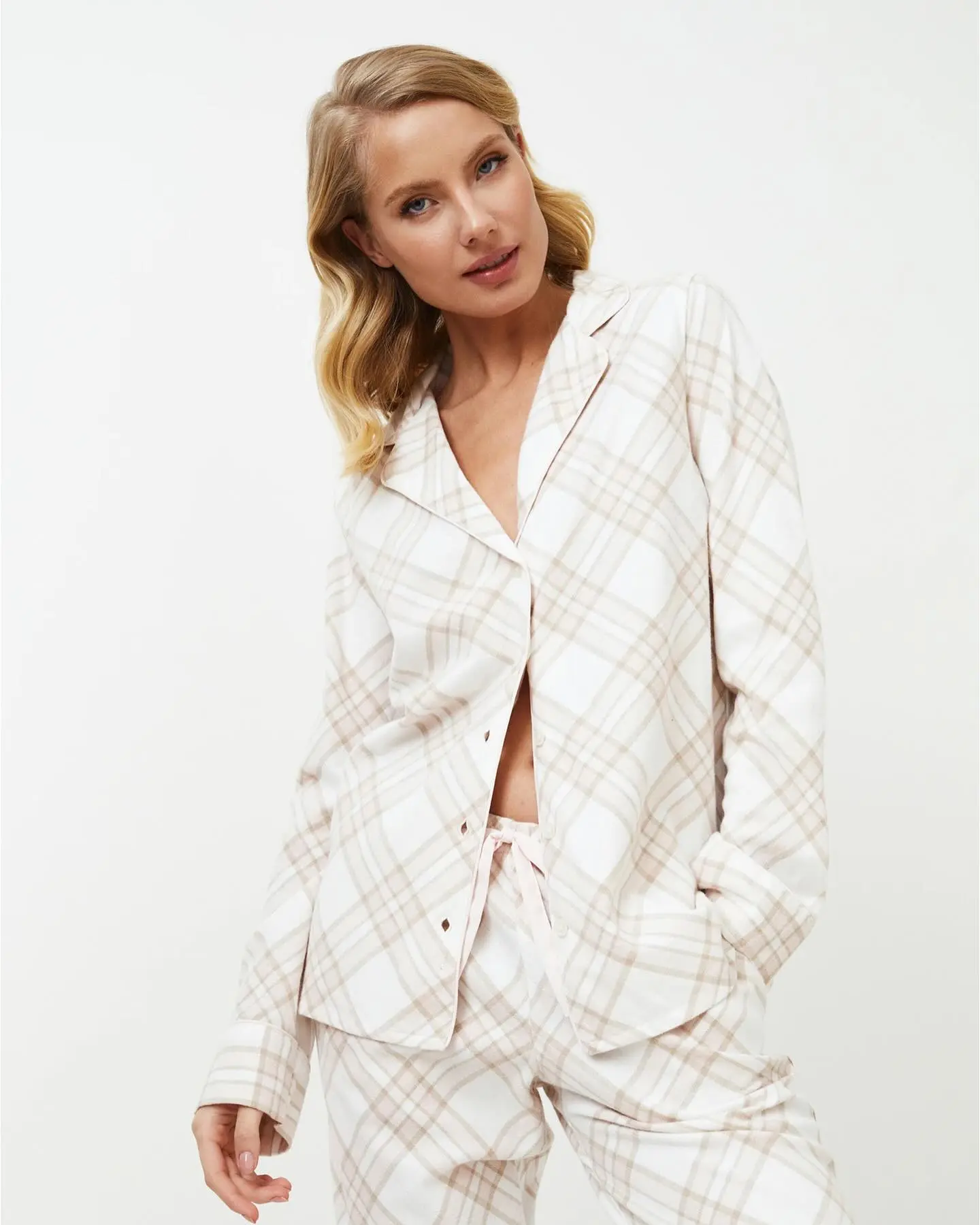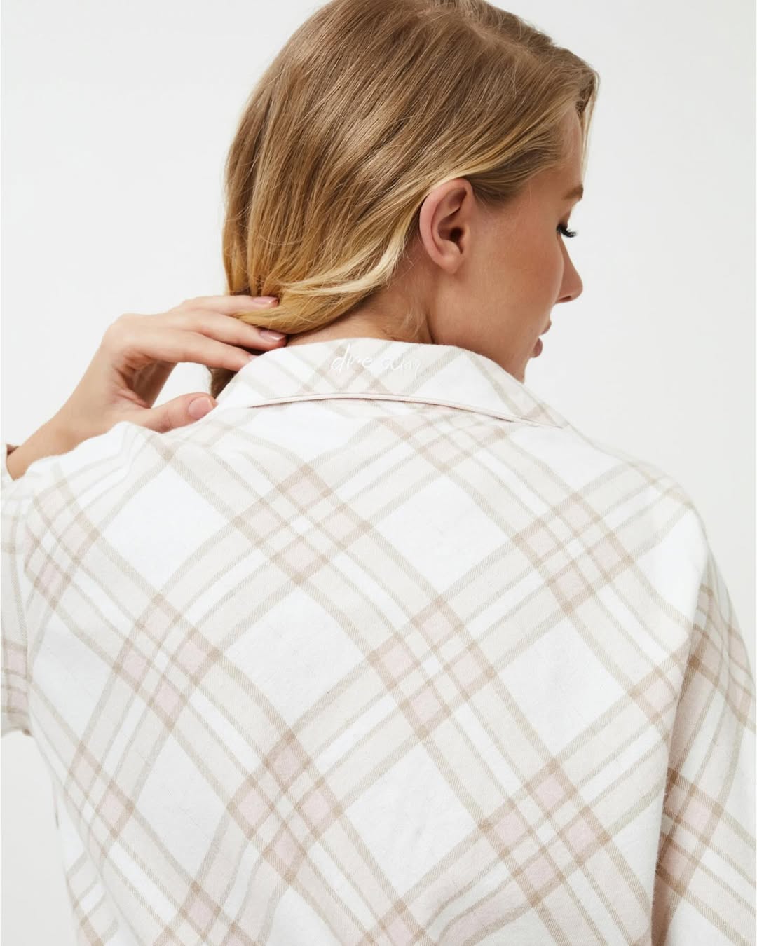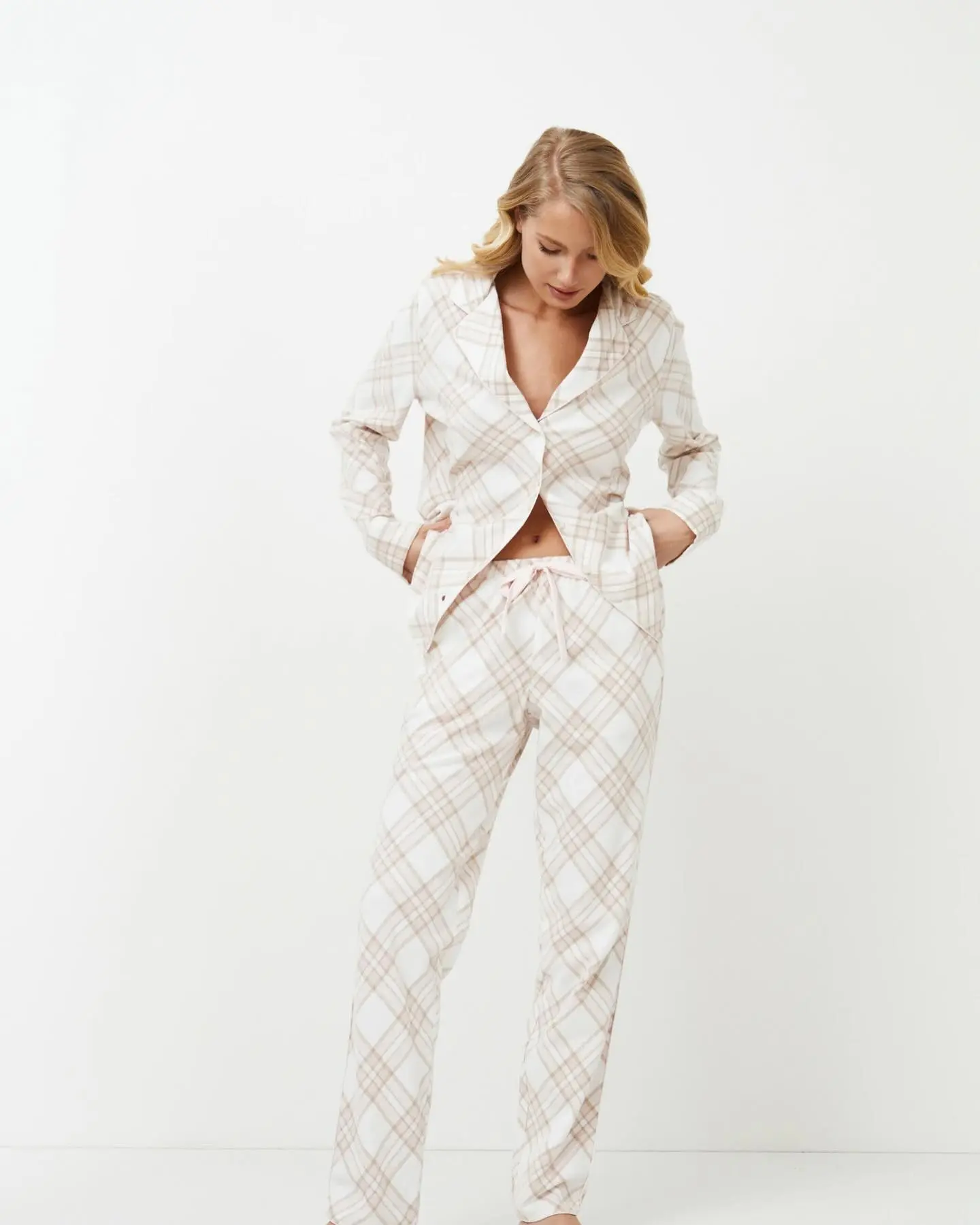 De Camille Long pyjama is een tijdloze klassieker in zachte tinten. Gemaakt van zacht katoen in een rustgevend wit, beige en roze ruitpatroon. Het overhemd met lange mouwen en knopen heeft een V-hals en is versierd met een delicate ‘Dream’ borduursel op de rug, wat een subtiele touch van elegantie toevoegt. De broek in klassieke snit is voorzien van handige zijzakken en wordt op de taille vastgemaakt met een zacht roze strikje. Biesjes sieren de kraag van het overhemd, de manchetten en de zijkanten van de broek. Draag de Camille Long pyjama voor een rustige en stijlvolle nachtrust.