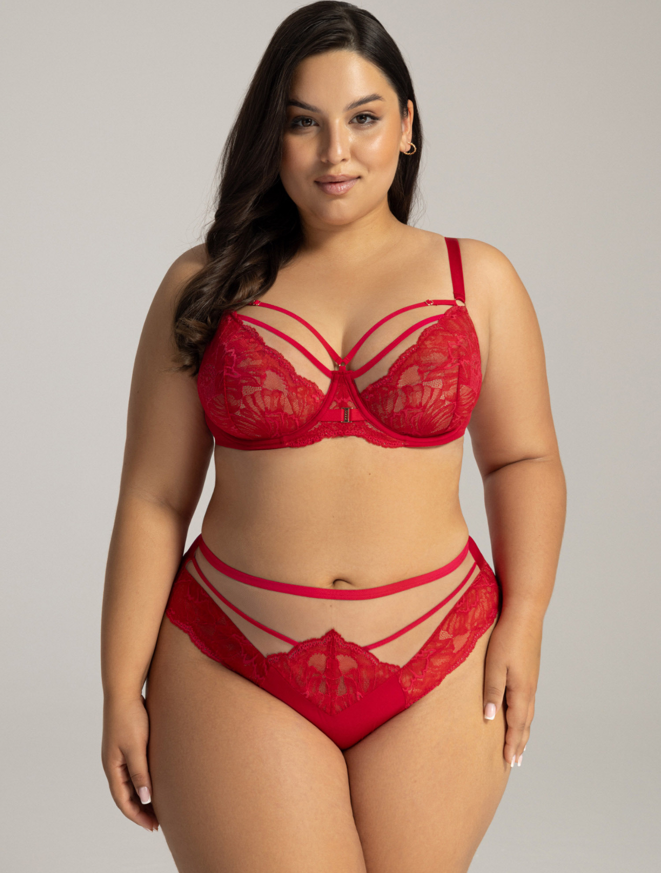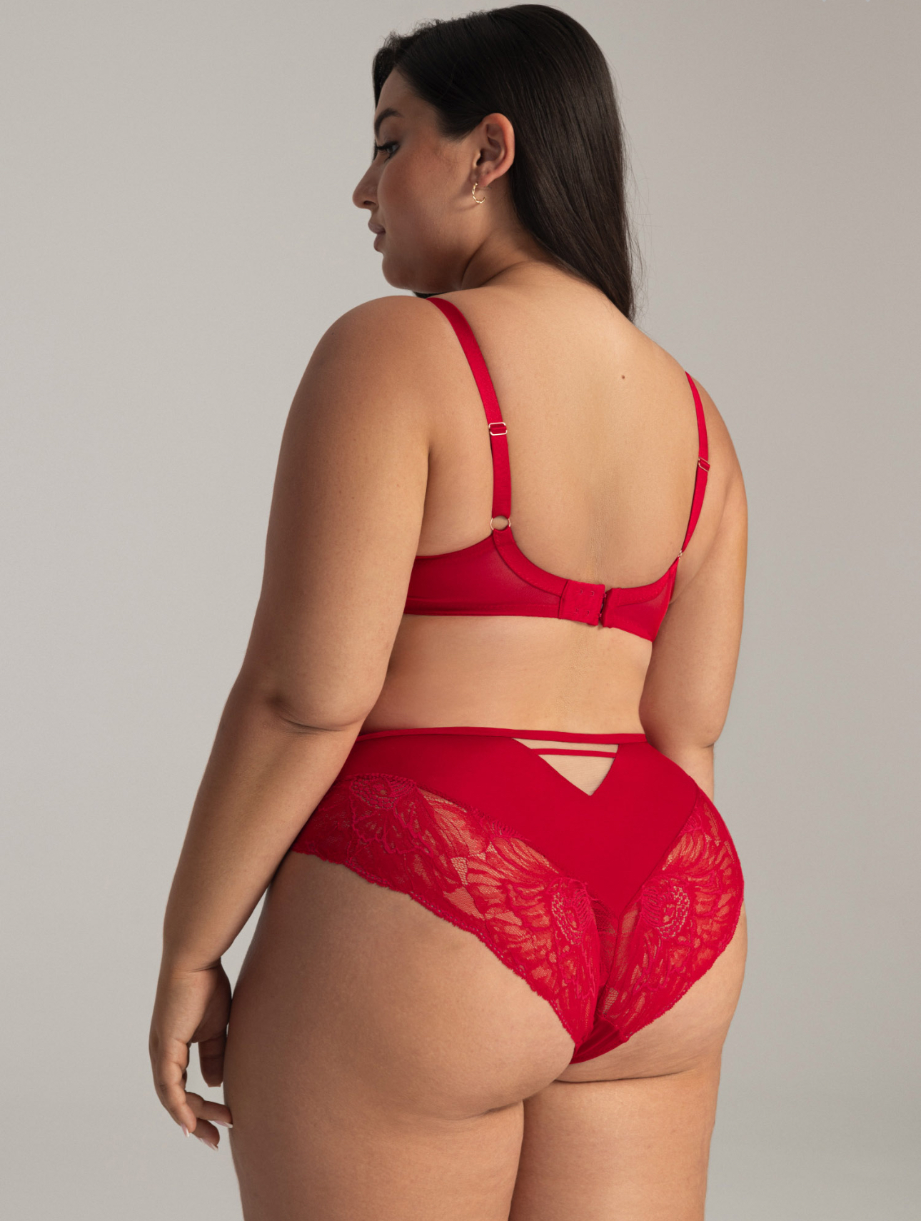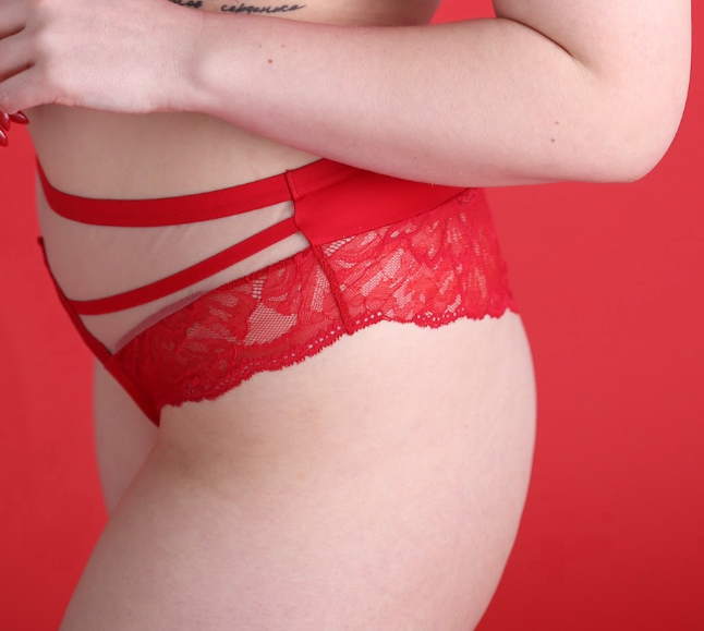 Elegant rood slipje, versierd met verfijnd kant, geeft een gevoel van vrouwelijkheid en zelfvertrouwen. Het romantische en tegelijkertijd sensuele ontwerp maakt dit model een veelzijdige keuze voor zowel speciale momenten als dagelijks dragen.