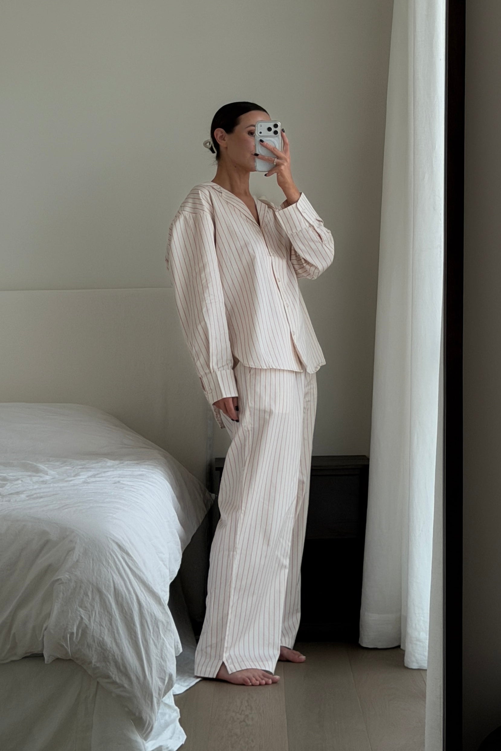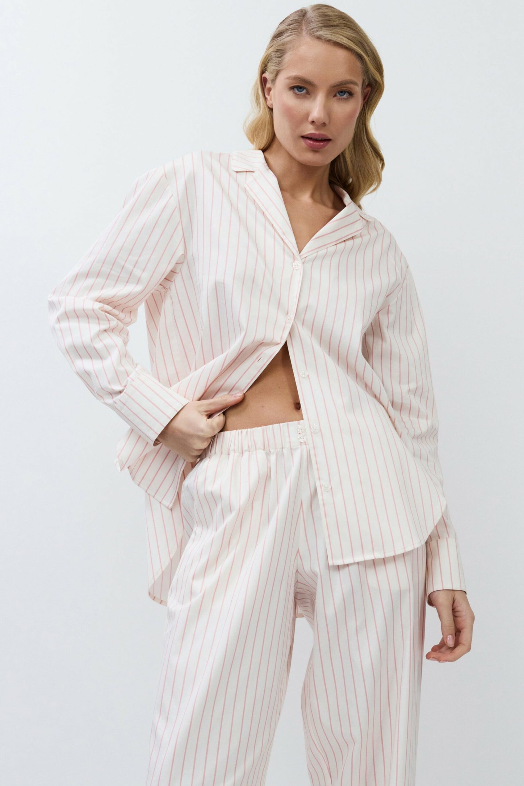 Klassieke en romantische pyjama set met broek met felroze strepen op lichtroze achtergrond van Aruelle!