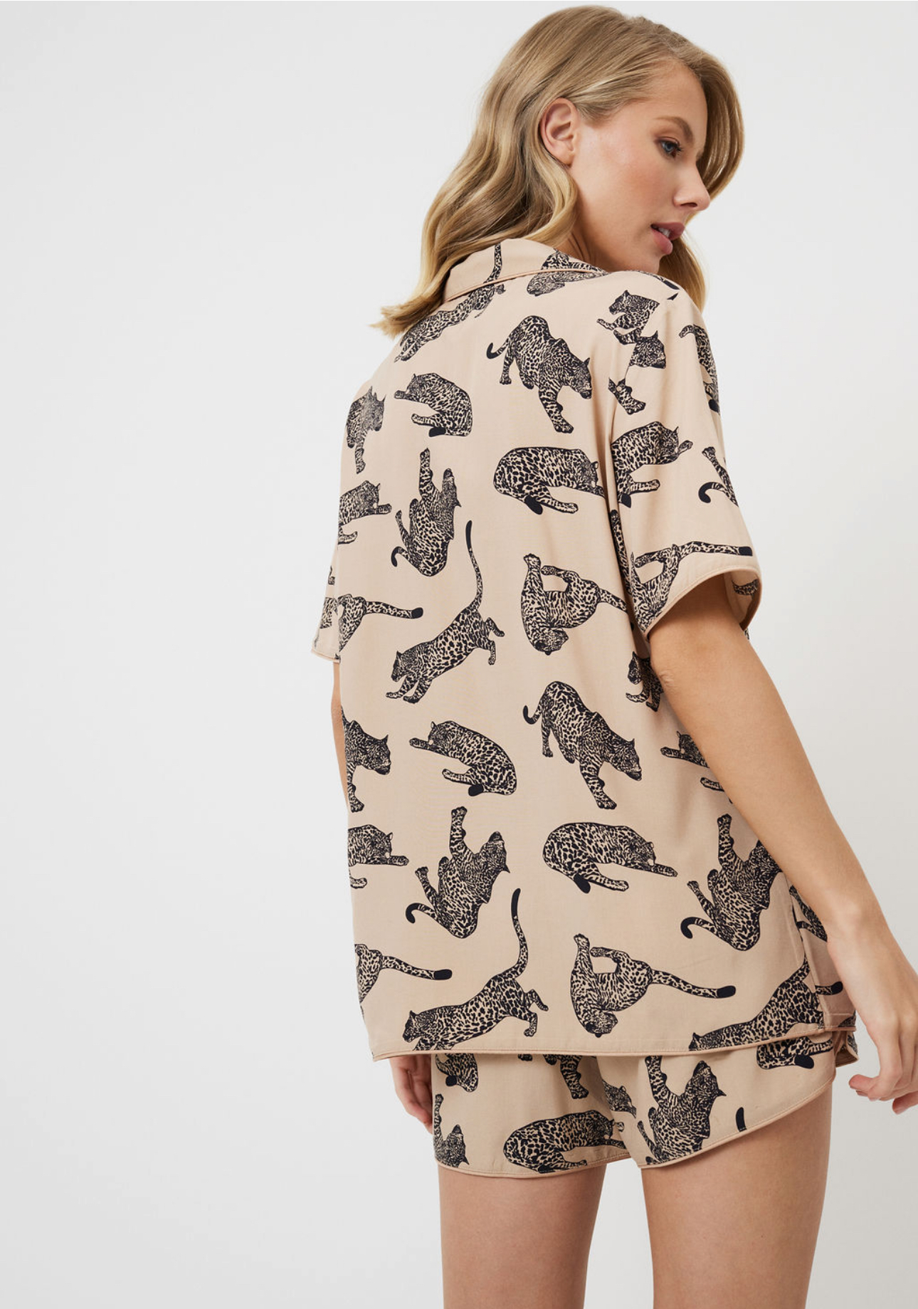 Wij presenteren de Soraya short pyjamaset – ga op een stijlvolle safari waarbij comfort en elegantie in elk detail samenkomen.