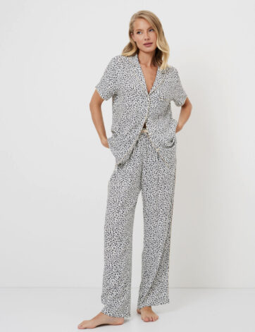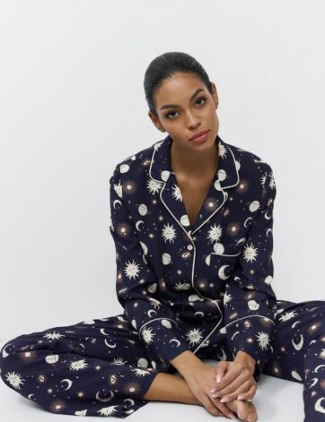 Klassieke pyjamaset met broek in diep donkerblauw met contrasterende witte print van sterren, planeten, manen en zonnen