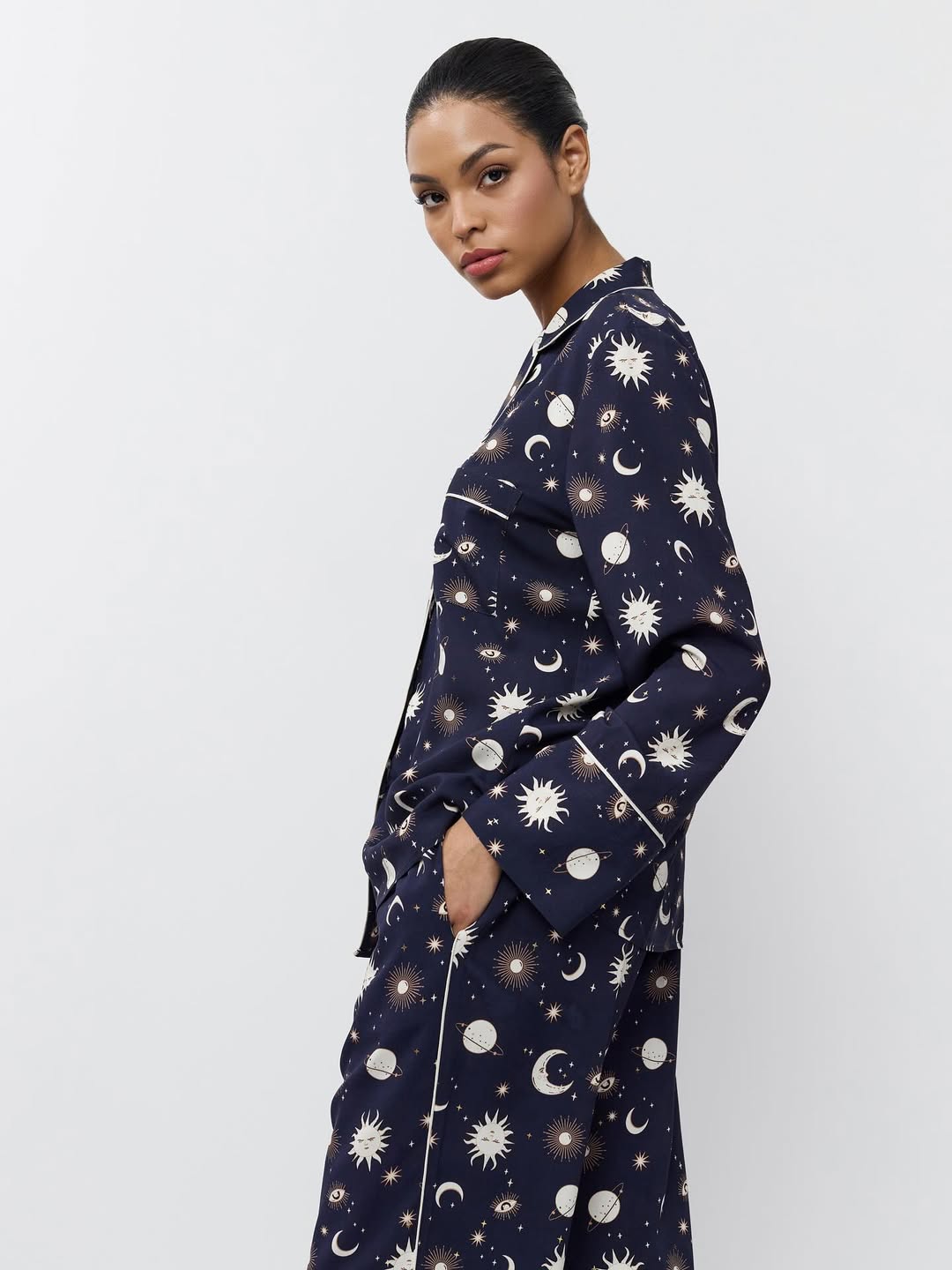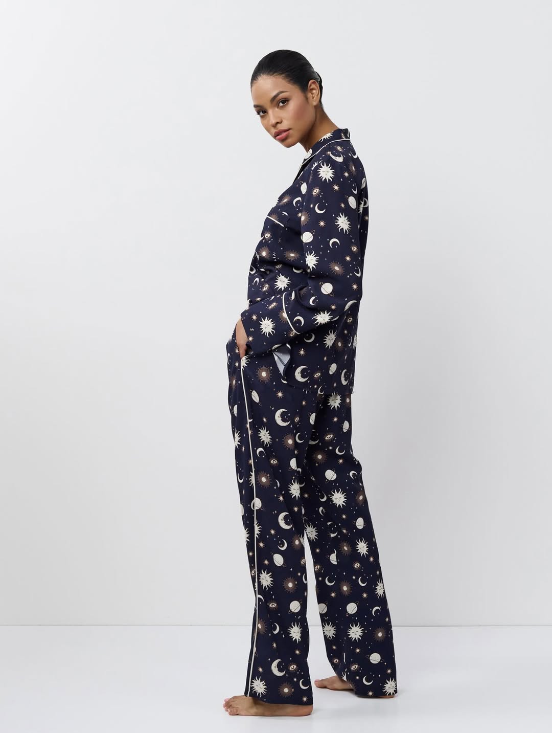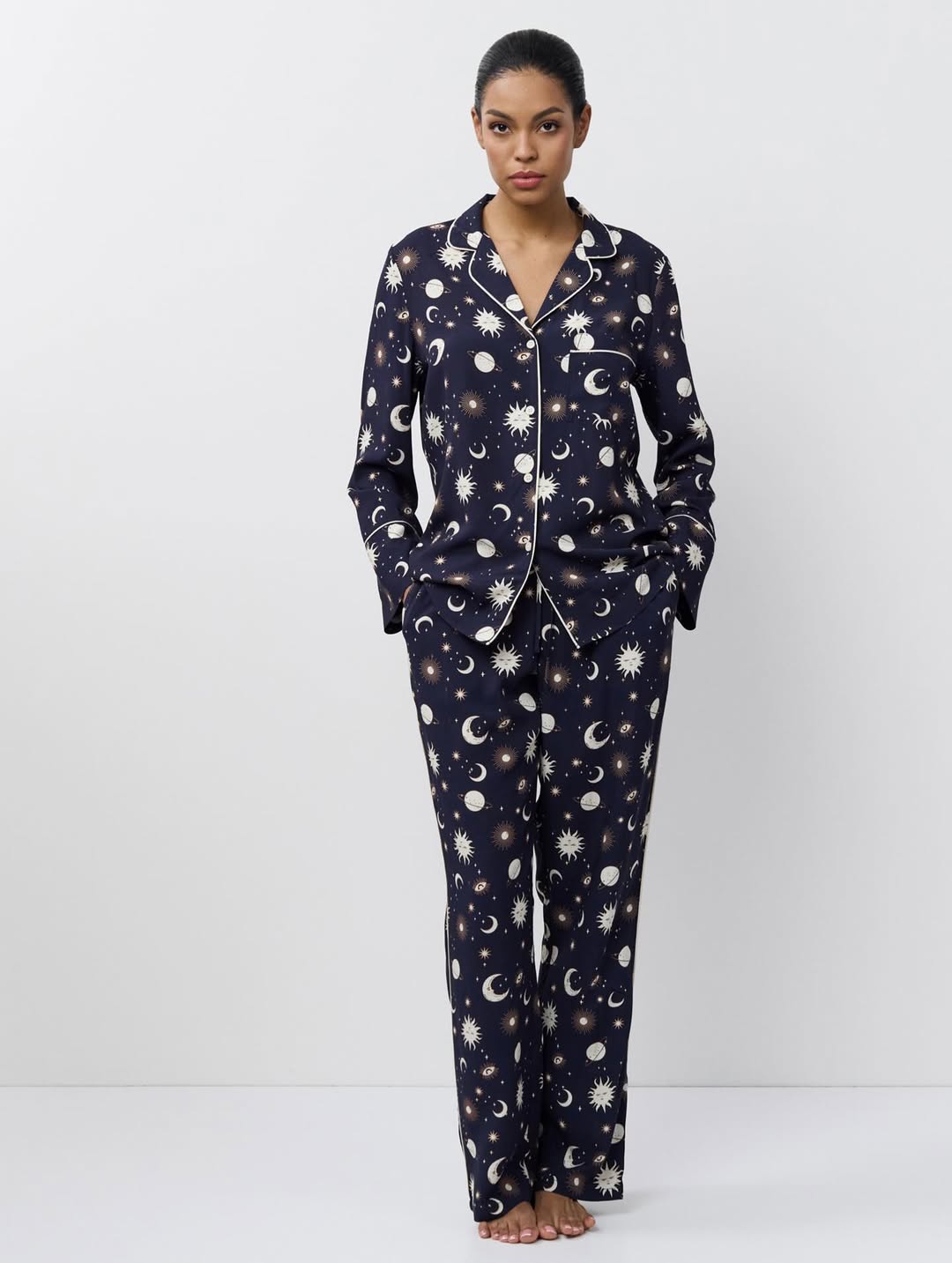 Klassieke pyjamaset met broek in diep donkerblauw met contrasterende witte print van sterren, planeten, manen en zonnen