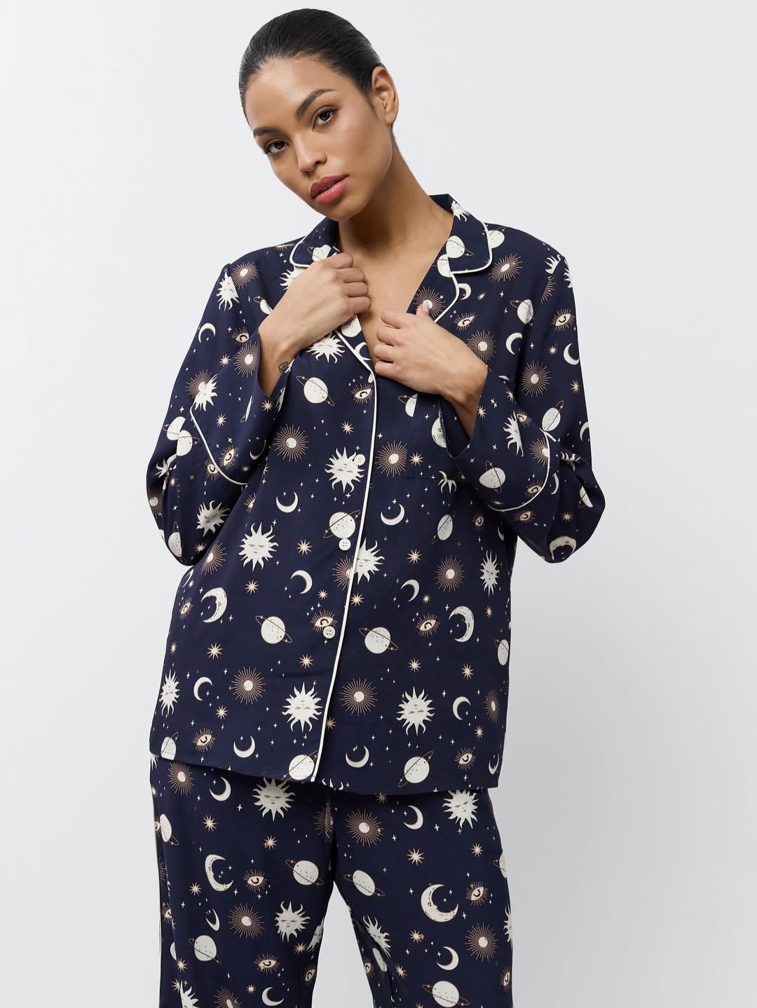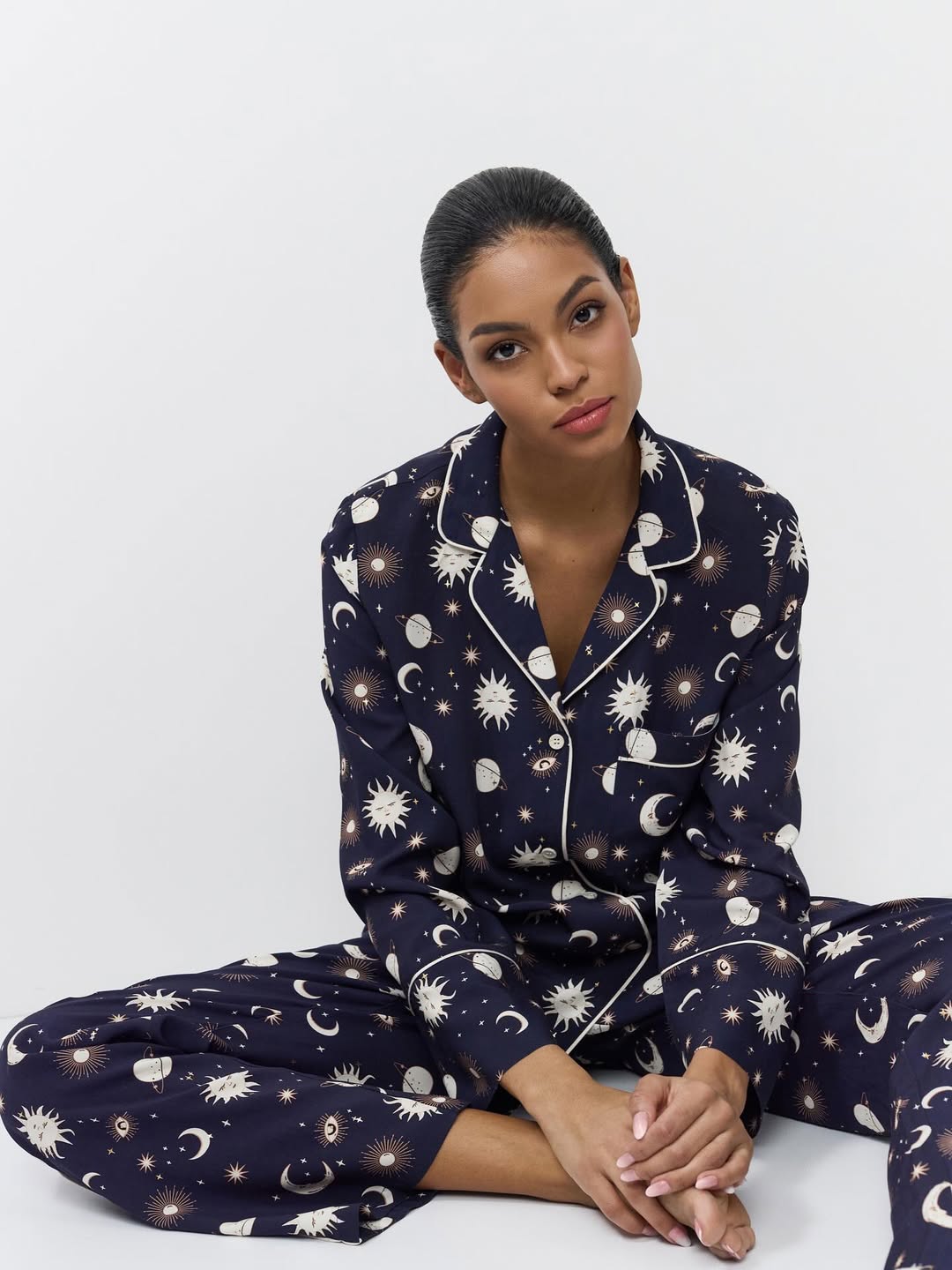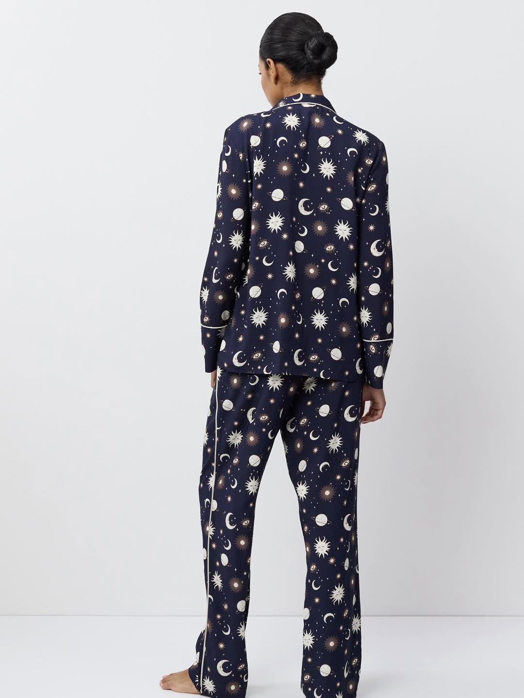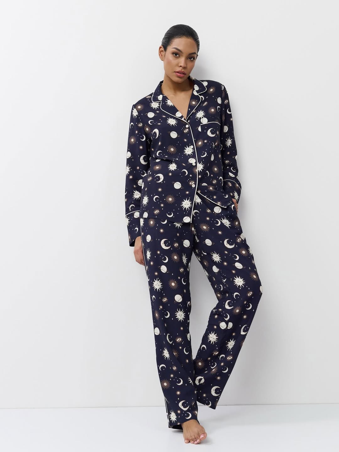 Klassieke pyjamaset met broek in diep donkerblauw met contrasterende witte print van sterren, planeten, manen en zonnen
